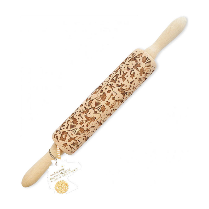 Πλάστης ζαχαροπλαστικής της εταιρείας Scrap Cooking, με σχέδιο μονόκερος. Είναι κατασκευασμένος από ξύλο οξιάς, κατάλληλο για επαφή με τρόφιμα, σε φυσική απόχρωση. Χάρη στη χάραξη του το μοτίβο τυπώνεται τέλεια στη ζύμη και παραμένει μετά το ψήσιμο. Χρησιμοποιήστε τον για να φτιάξετε εντυπωσιακά σχέδια σε μπισκότα, ζύμες και όπου αλλού θέλετε. Συνιστάται να αλευρώσετε το ρολό πριν το χρησιμοποιήσετε στη ζύμη.