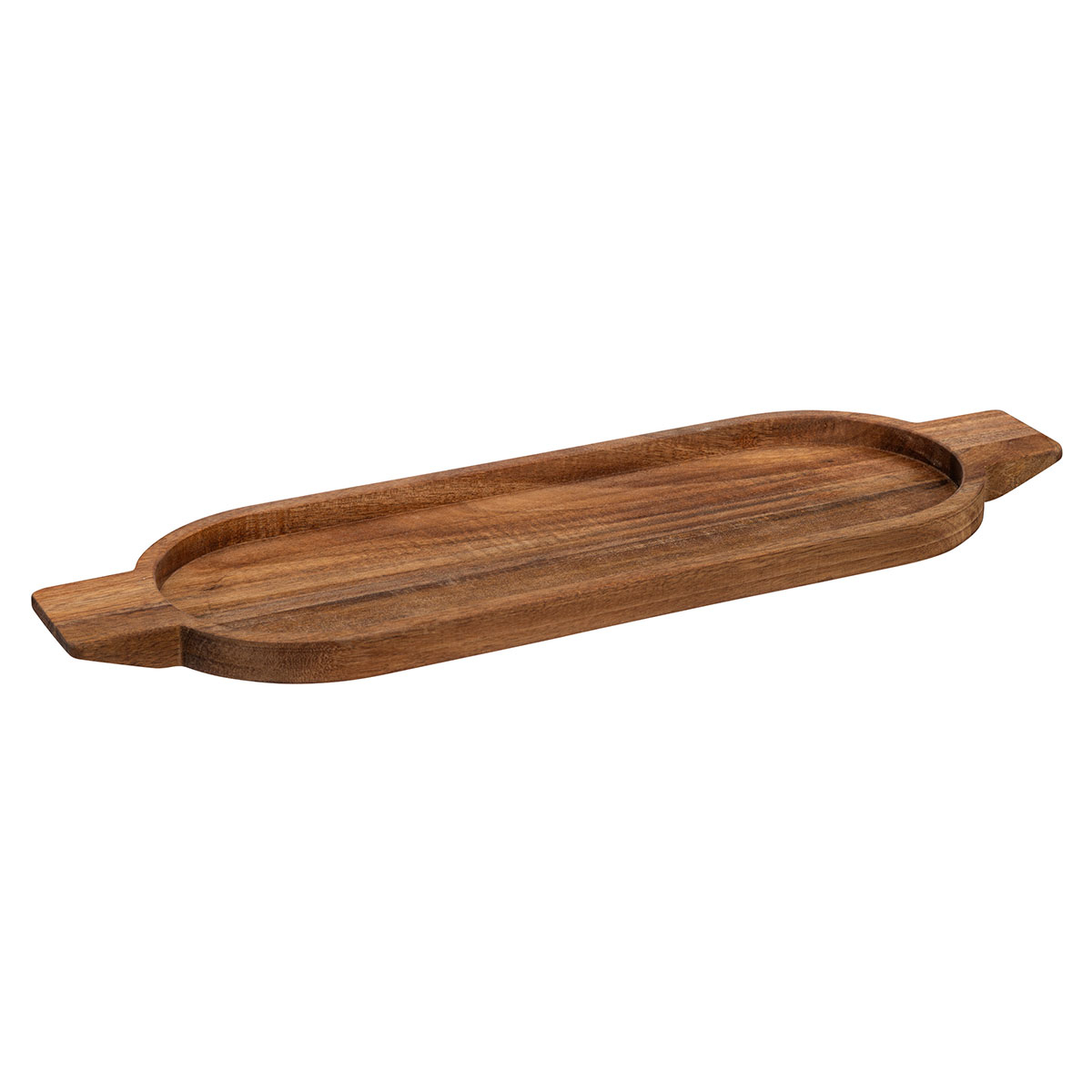 Πλατώ σερβιρίσματος κατασκευασμένο από ξύλο ακακίας σε καφέ χρώμα. Διαθέτει λαβές για εύκολη μεταφορά. Ιδανικό πλατώ για να σερβίρετε μικρούς μεζέδες ή τυριά στην μέση του τραπεζιού σας. *Λόγω της φυσικής του κατάστασης είναι πιθανό να παρουσιάσει μικρές διαφορές στο χρώμα.*