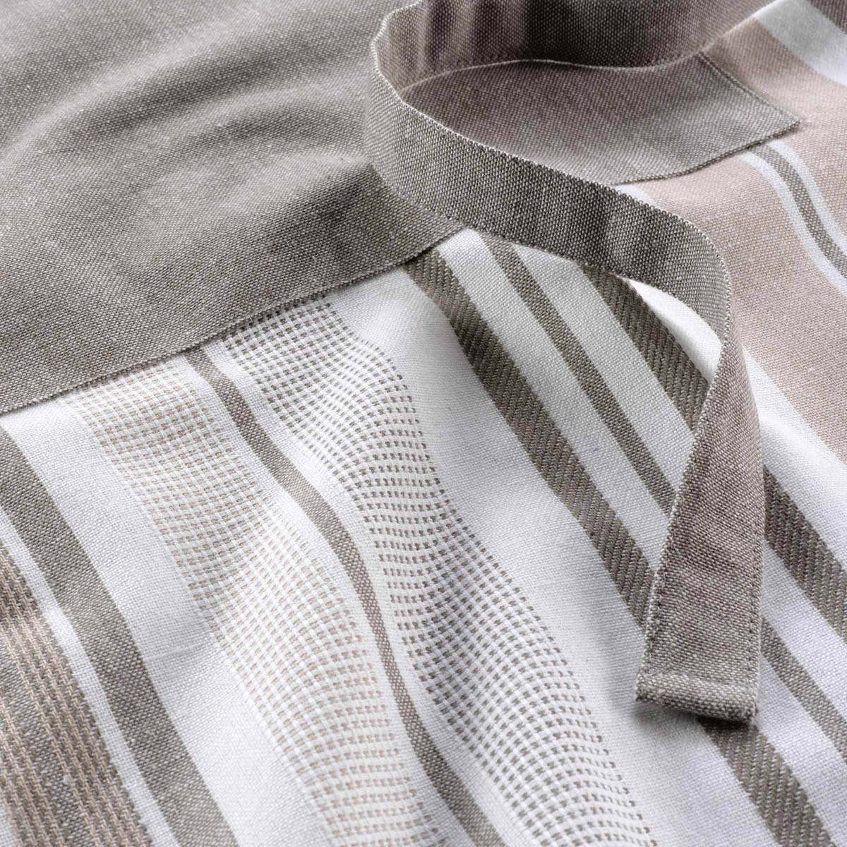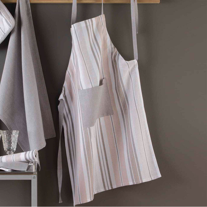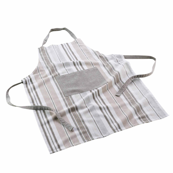 Ποδιά κουζίνας σε μπεζ αποχρώσεις με ριγέ σχέδιο και λευκές-καφέ λεπτομέρειες. Είναι κατασκευασμένη από 100% βαμβακερό ύφασμα. Διαθέτει μια μεγάλη τσέπη στο μπροστινό μέρος. Ιδανική για να αποφεύγονται οι ανεπιθύμητοι λεκέδες στα ρούχα κατά το μαγείρεμα.