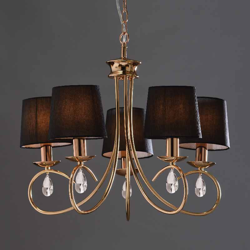Φωτιστικό οροφής - πολυέλαιος της εταιρείας Aca Decor σε μοντέρνο στυλ. Είναι μεταλλικό σε χρυσοχάλκινο χρώμα με διακοσμητικά κρυσταλλάκια (3.5εκ. X 6εκ.). Τα καπέλα είναι μαύρο σαγρέ ύφασμα. Το καλώδιο είναι κατασκευασμένο από PVC. Τύπος ντουί: 5xE14 και θέσεις για πέντε λαμπτήρες έως 40W έκαστος (δεν συμπεριλαμβάνονται).