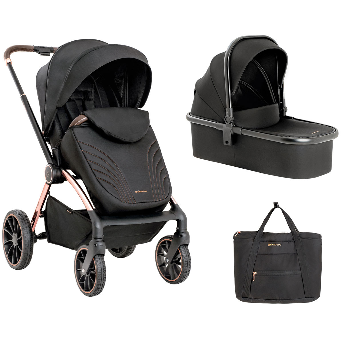 Καρότσι Kara της εταιρείας Kikka Boo σε μαύρο χρώμα με ροζ μεταλλικό σκελετό. Είναι κατάλληλο την γέννηση και μέχρι 4 ετών ή 22kg. Πολυλειτουργικό, με πορτ μπεμπέ που κουμπώνει στο καρότσι και πρακτική τσάντα αλλαγής πάνας.