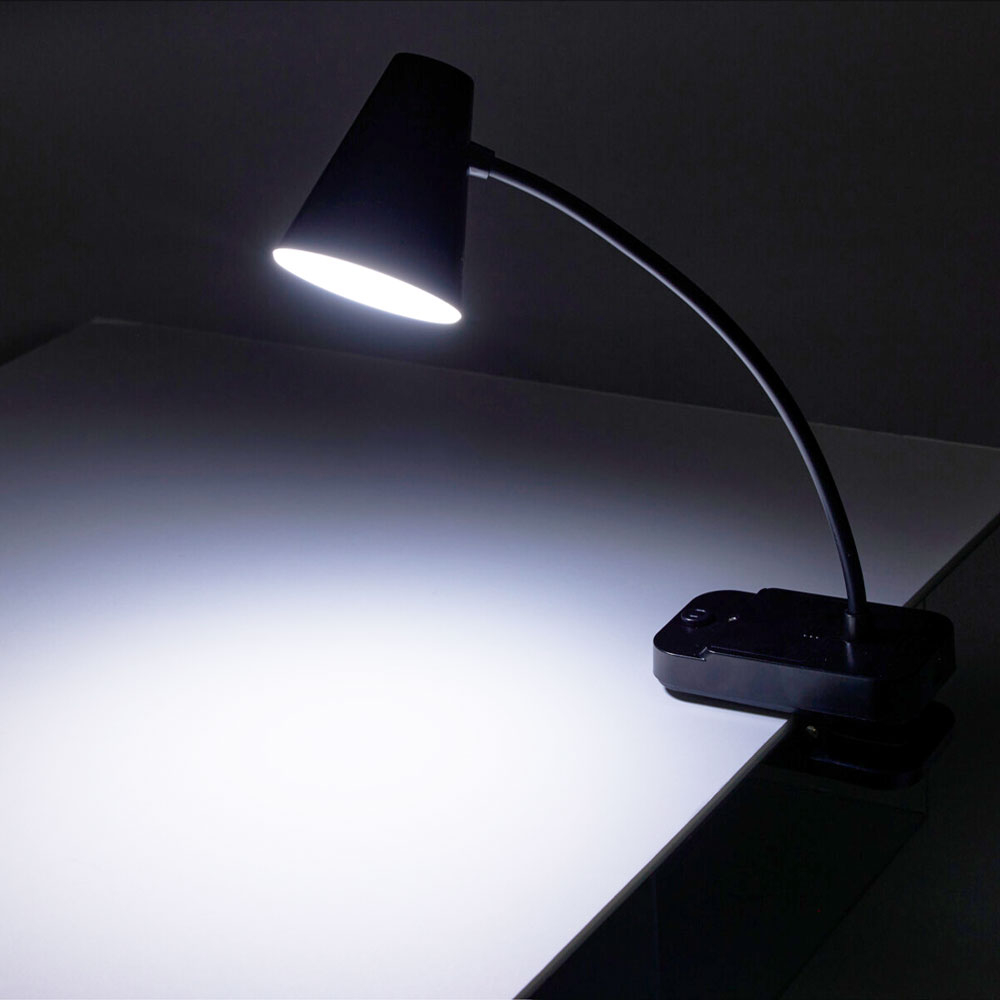 Επιτραπέζιο φωτιστικό σε μίνιμαλ στυλ με κλιπ και εύκαμπτο βραχίονα. Είναι κατασκευασμένο από πλαστικό υλικό σε μαύρο χρώμα με μεταλλικά μέρη. Λειτουργεί με 3 μπαταρίες ΑΑΑ (δεν περιλαμβάνονται) ή με καλώδιο USB C. Διαθέτει 18 λαμπάκια Led με ψυχρό φως με μέγιστη ισχύ 3 Watt. Ιδανικό για γραφείο, διάβασμα ή εργασία, προσφέροντας πρακτικό και στοχευμένο φωτισμό.