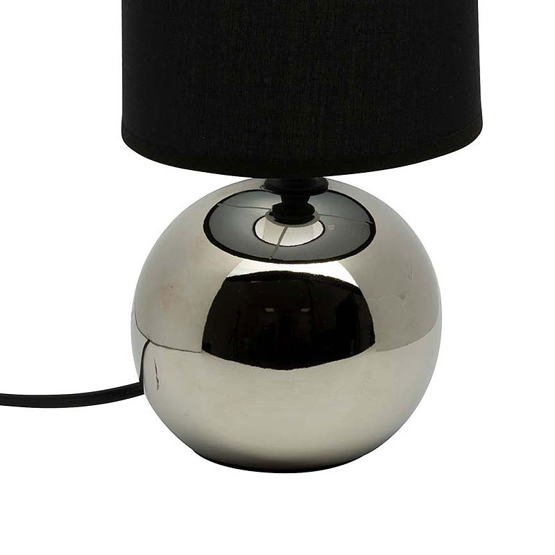 Πορτατίφ κομοδίνου με μίνιμαλ σχέδιο. Έχει κεραμικό σκελετό σε ασημί χρώμα και μαύρο υφασμάτινο καπέλο. Διαθέτει καλώδιο 120εκ. για παροχή ρεύματος. Τύπος ντουί: 1xE14 και θέση για 1 λαμπτήρα έως 60W (δεν συμπεριλαμβάνεται).