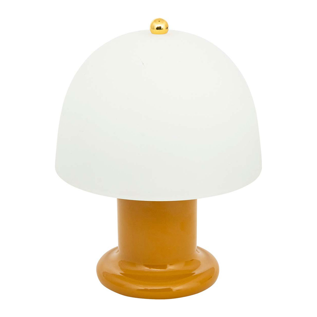 Επιτραπέζιο φωτιστικό με μοντέρνο ύφος. Είναι κατασκευασμένο από μεταλλικό υλικό σε μουσταρδί χρώμα με λευκό γυάλινο καπέλο. Λειτουργεί με 3 μπαταρίες 3 ΑΑΑ.