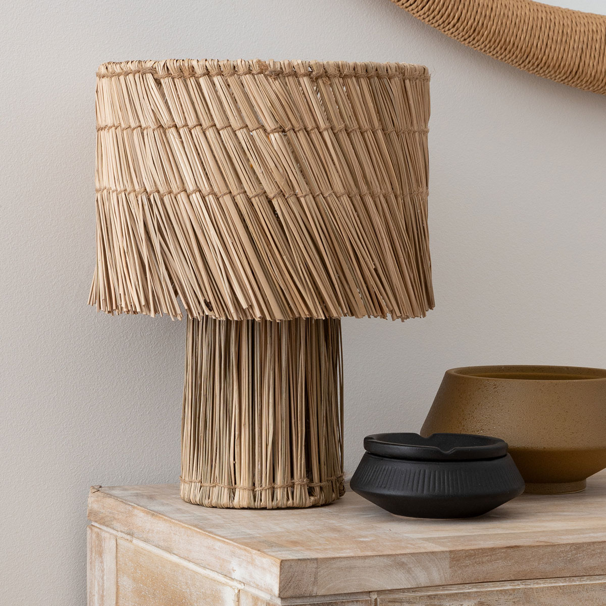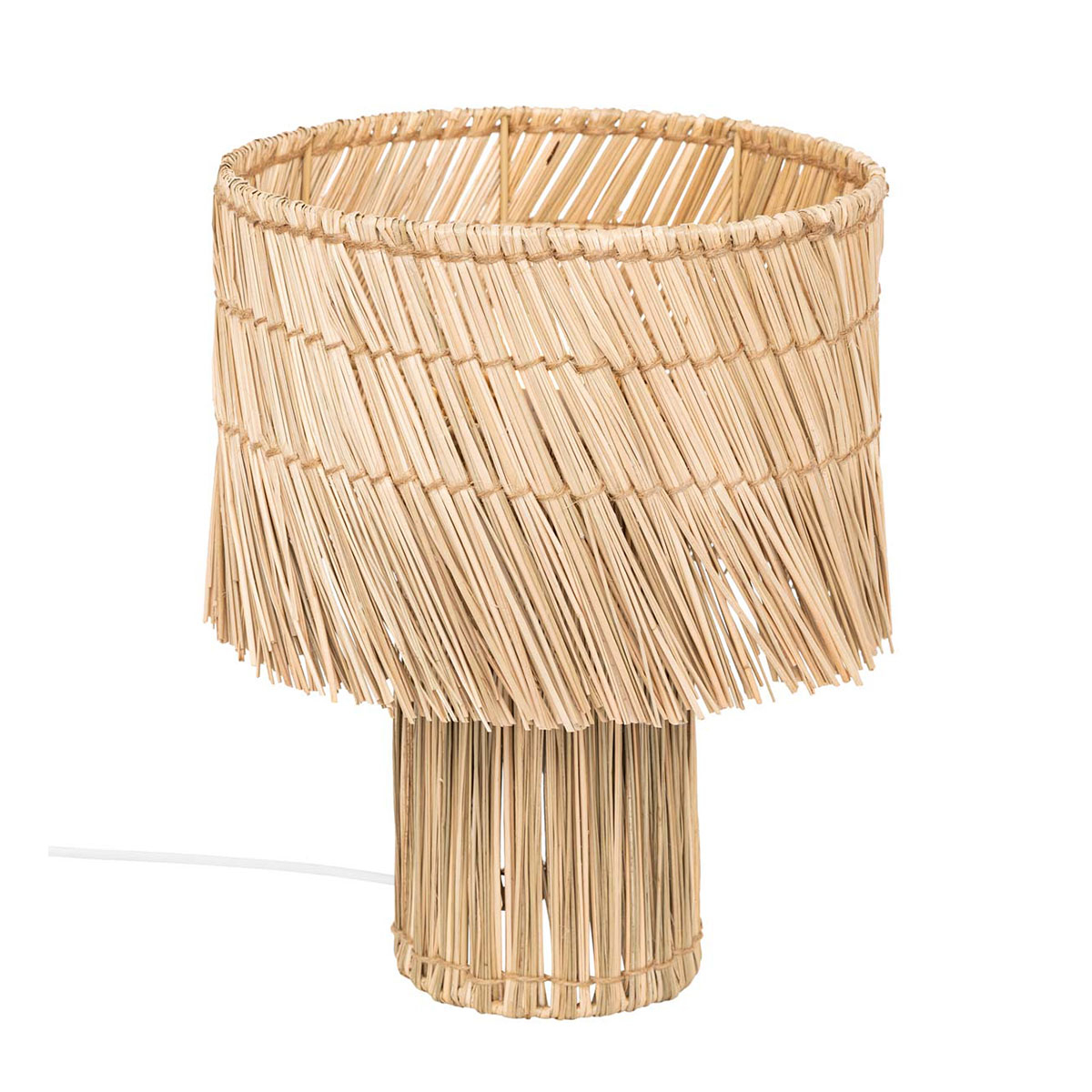 Επιτραπέζιο φωτιστικό με μοντέρνο στυλ. Είναι κατασκευασμένο από φυσική ψάθα σε μπεζ χρώμα και έχει μεταλλικό σκελετό. Διαθέτει καλώδιο για παροχή ρεύματος με διακόπτη On/Off. *Το προϊόν έρχεται αμοντάριστο και συναρμολογείται βάσει οδηγιών.* Τύπος ντουί: 1xE27 και θέση για 1 λαμπτήρα έως 40W (δεν συμπεριλαμβάνεται).