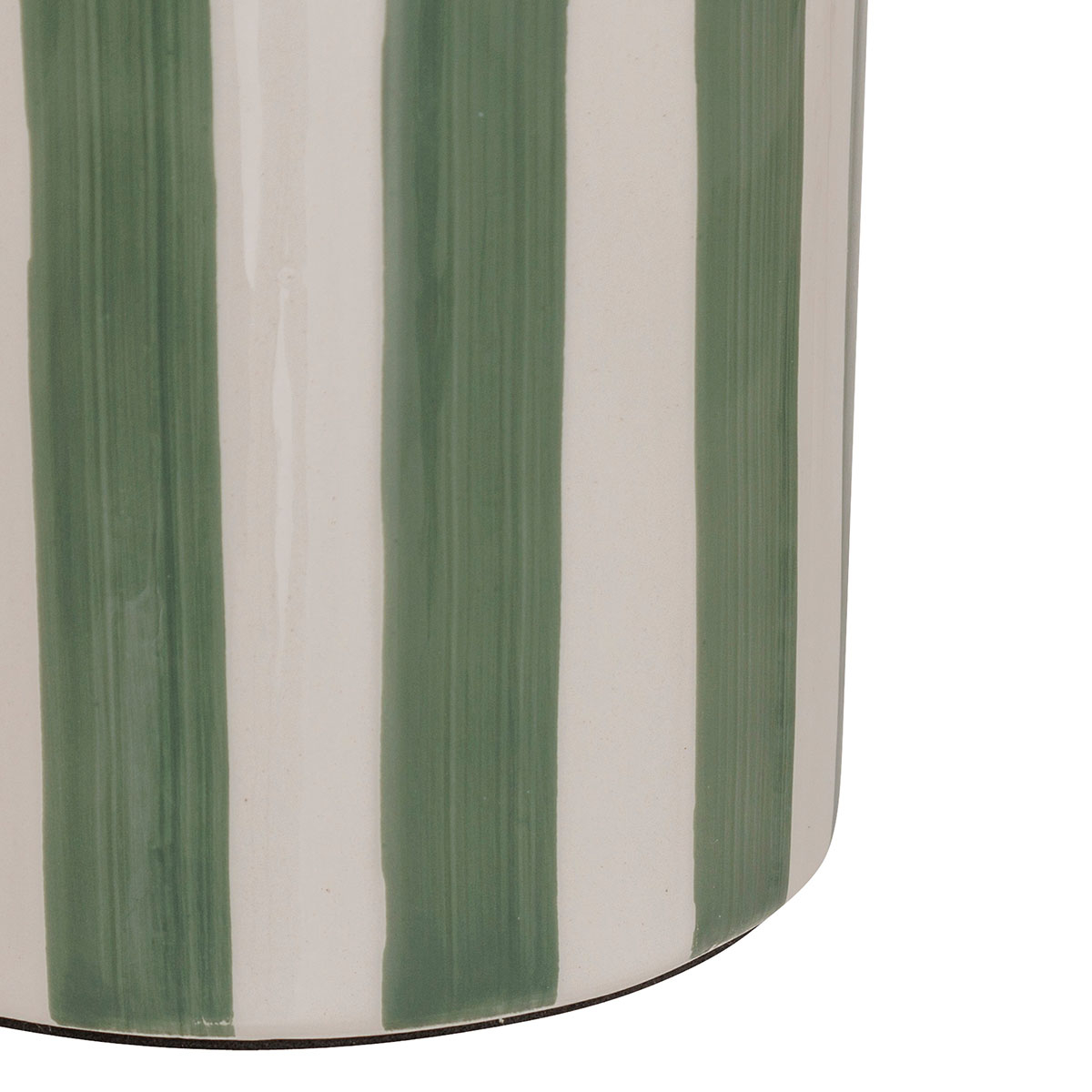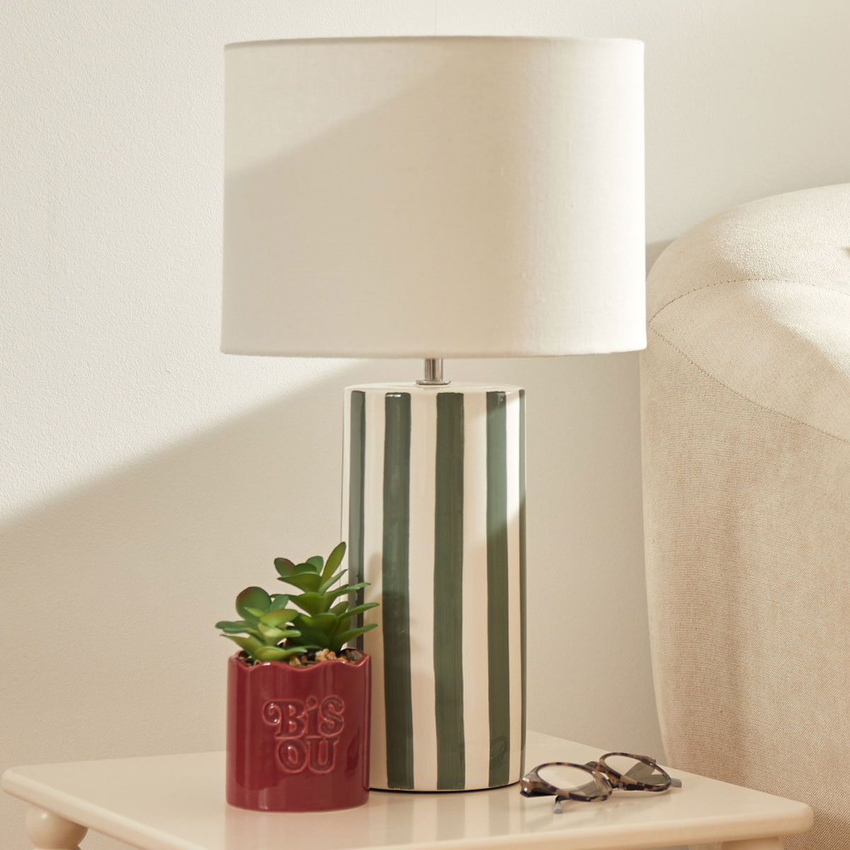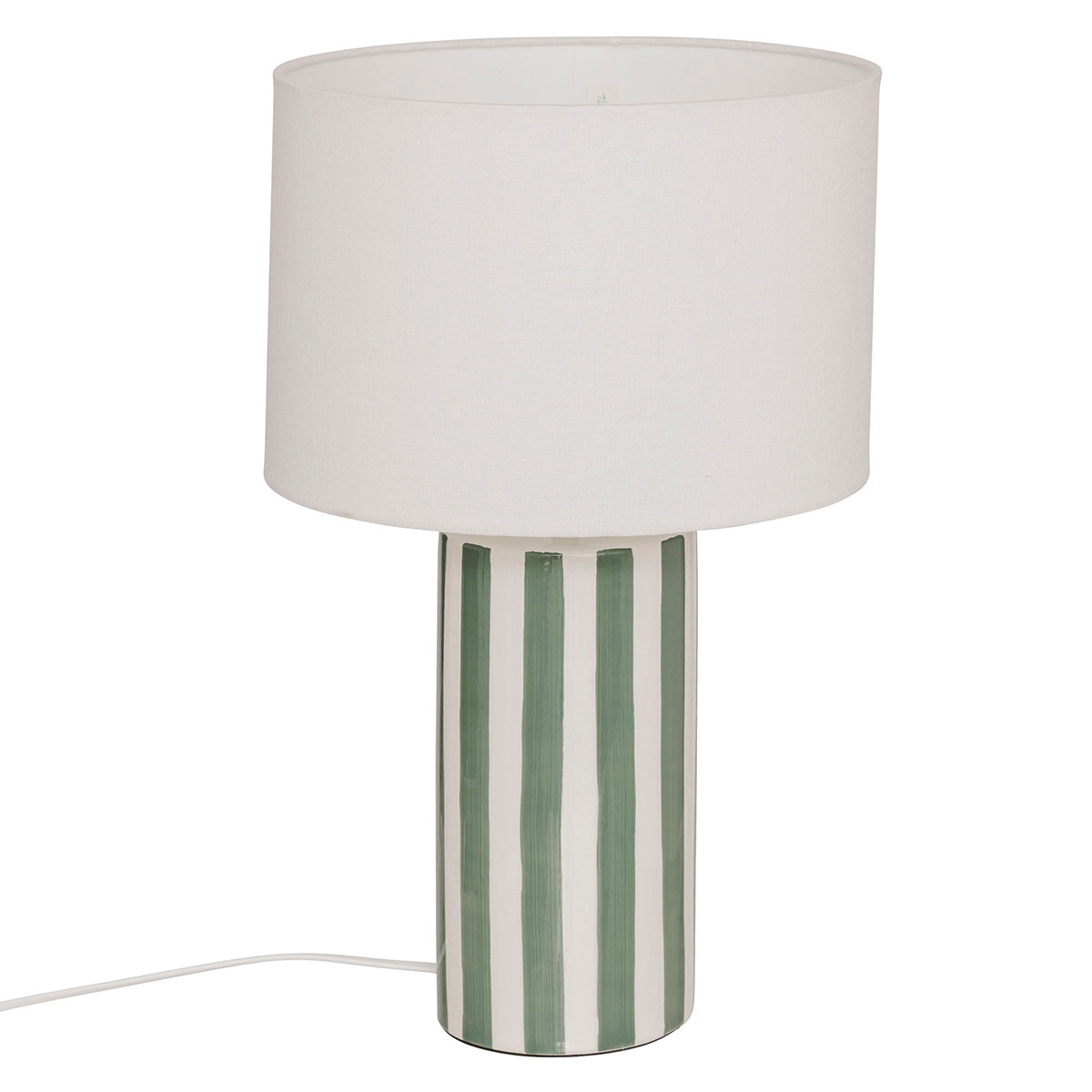 Πορτατίφ με μοντέρνα αισθητική. Είναι κατασκευασμένο από κεραμικό υλικό σε λευκό και χακί χρώμα με ριγέ σχέδιο και έχει λευκό υφασμάτινο καπέλο. Διαθέτει καλώδιο 120εκ. για παροχή ρεύματος με διακόπτη On/Off. Αποτελεί μια υπέροχη και μοναδική διακοσμητική επιλογή. Ιδανικό φωτιστικό για τοποθέτηση σε όλους τους χώρους του σπιτιού και να δώσει μια μοντέρνα πινελιά. Τύπος ντουί: 1xE14 και θέση για 1 λαμπτήρα έως 60W (δεν συμπεριλαμβάνεται). Συνδυάστε το με τα υπόλοιπα είδη της ίδιας σειράς για ένα ολοκληρωμένο αποτέλεσμα.