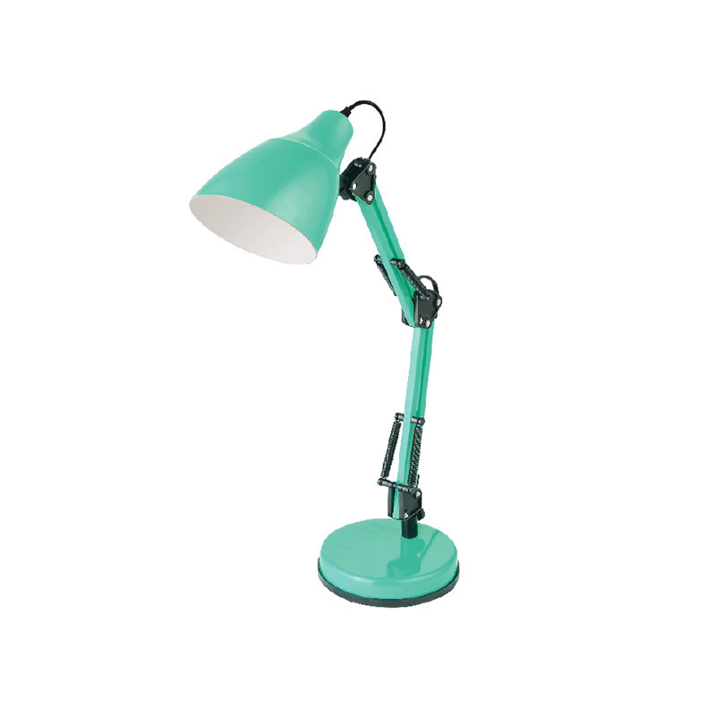 Φωτιστικό γραφείου της εταιρείας Aca Decor σε μοντέρνο στυλ με περιστρεφόμενη κεφαλή και κινούμενο σκελετό. Είναι μεταλλικό σε τυρκουάζ χρώμα με μαύρα πλαστικά σημεία. Το καλώδιο είναι κατασκευασμένο από PVC με μήκος 1,5 μέτρα. Τύπος ντουί: 1xE27 και θέση για ένα λαμπτήρα έως 40W (δεν συμπεριλαμβάνεται).
