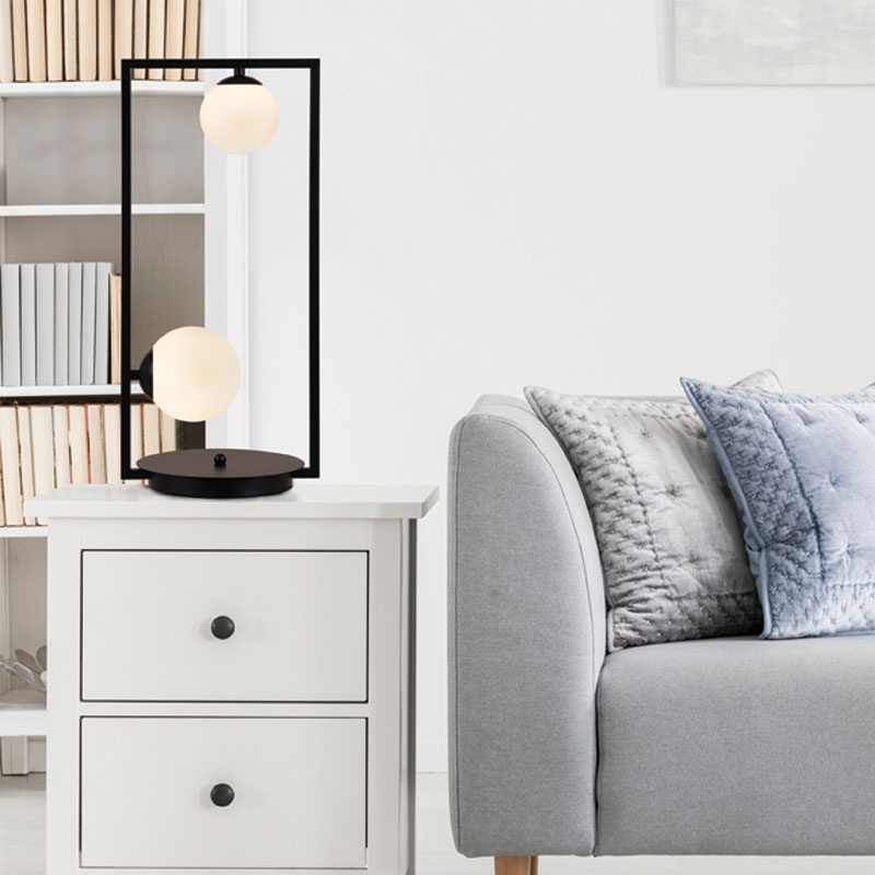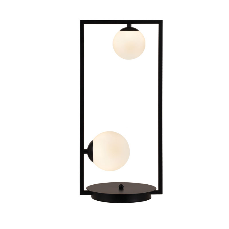 Επιτραπέζιο φωτιστικό της εταιρείας Aca Decor σε μοντέρνο στυλ. Έχει μεταλλικό σκελετό σε μαύρο ματ χρώμα και φέρει 2 λευκές γυάλινες μπάλες. Διαθέτει μαύρο καλώδιο από PVC με διακόπτη ON/OFF μήκους 150εκ. Τύπος ντουί: 2xG9 και θέσεις για 2 λαμπτήρες έως 28W (δεν συμπεριλαμβάνονται).