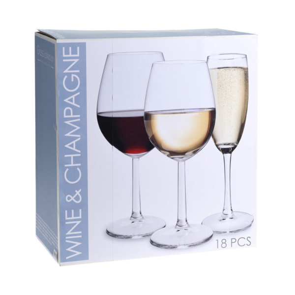 Ποτήρια για το κρασί και την σαμπάνια σε διάφανο χρώμα. Είναι κατασκευασμένα από γυαλί και έχουν μοντέρνο σχεδιασμό. Προσφέρουν ιδιαίτερο στυλ στο τραπέζι σας και κερδίζουν τις εντυπώσεις. Στο σετ περιλαμβάνονται 6 ποτήρια σαμπάνιας, 6 ποτήρια για λευκό κρασί και 6 ποτήρια για κόκκινο κρασί.