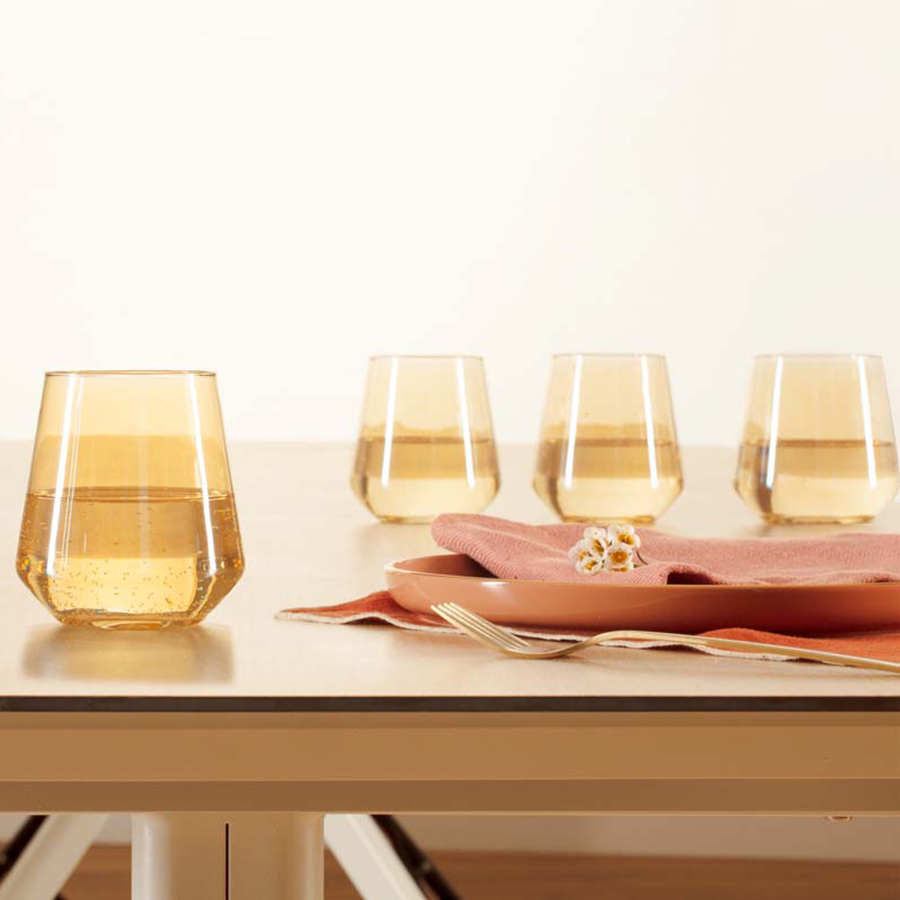 Σετ ποτήρια νερού με μίνιμαλ σχεδιασμό. Είναι γυάλινα σε απόχρωση κεχριμπαριού. Ιδανικά για νερό, αναψυκτικό ή χυμό. Χωρητικότητα 450ml.