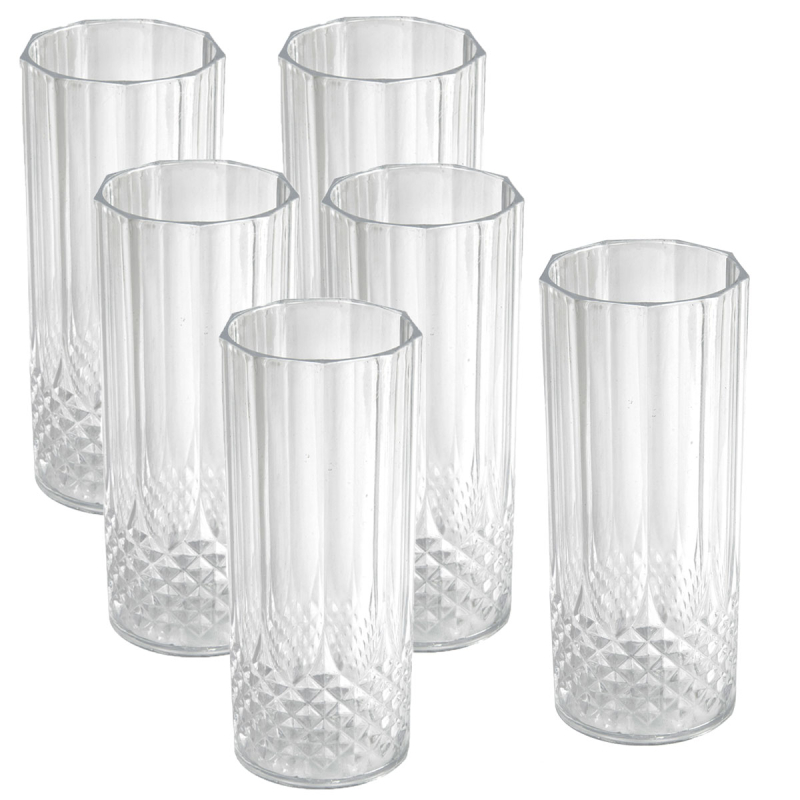 Ποτήρια ποτού σε σετ με μοντέρνο σχεδιασμό. Κατασκευασμένα από διάφανο πλαστικό υλικό. Είναι κατάλληλα για χώρους που δεν επιτρέπονται γυάλινα ποτήρια όπως σε πισίνα ή σε πικ νικ. Ιδανικά ποτήρια για πάρτυ ή μπάρμπεκιου. Το σετ περιλαμβάνει 6 ποτήρια με χωρητικότητα 400ml.