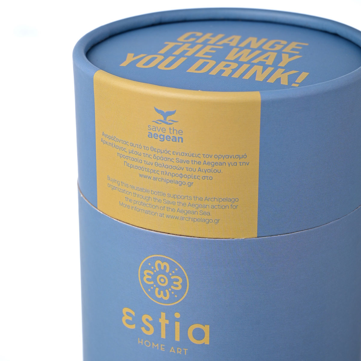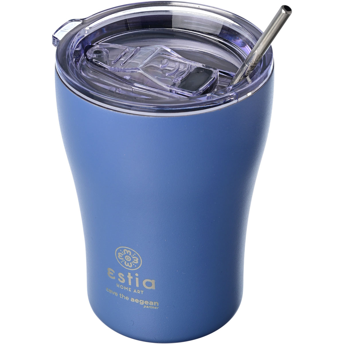 Θερμός με μορφή κούπας της εταιρείας εstia από την σειρά "Save The Aegean". Η εταιρεία εstia συνεισφέρει στον οργανισμό "Save The Aegean" με 1% επί των πωλήσεων, για καθαρότερες θάλασσες και ένα καλύτερο αύριο. Άριστη ποιότητα κατασκευής από ανοξείδωτο ατσάλι 304 που ανταποκρίνεται σε υψηλές απαιτήσεις, εγγυάται μεγαλύτερη αντοχή στη μακροχρόνια χρήση και 100% αναλλοίωτη γεύση των υγρών. Το προϊόν είναι απαλλαγμένο από ουσίες BPA και είναι ασφαλές για επαφή με τρόφιμα και υγρά. Το διπλό τοίχωμα διατηρεί τα υγρά 12 ώρες κρύα και 6 ώρες ζεστά. Το μπλε χρώμα τοποθετείται μέσω της αποτελεσματικότερης τεχνικής powder coating, η οποία προσφέρει ένα ματ αποτέλεσμα και μεγάλη αντοχή στην μακροχρόνια χρήση. Ιδανικό για την βόλτα, το ταξίδι, το γραφείο. Το λογότυπο είναι χαραγμένο πάνω στο προϊόν. Η συσκευασία του είναι κατασκευασμένη από 100% ανακυκλώσιμα υλικά και μπορεί να χρησιμοποιηθεί για πολλαπλές χρήσεις. Συμπεριλαμβάνεται ανοξείδωτο καλαμάκι.