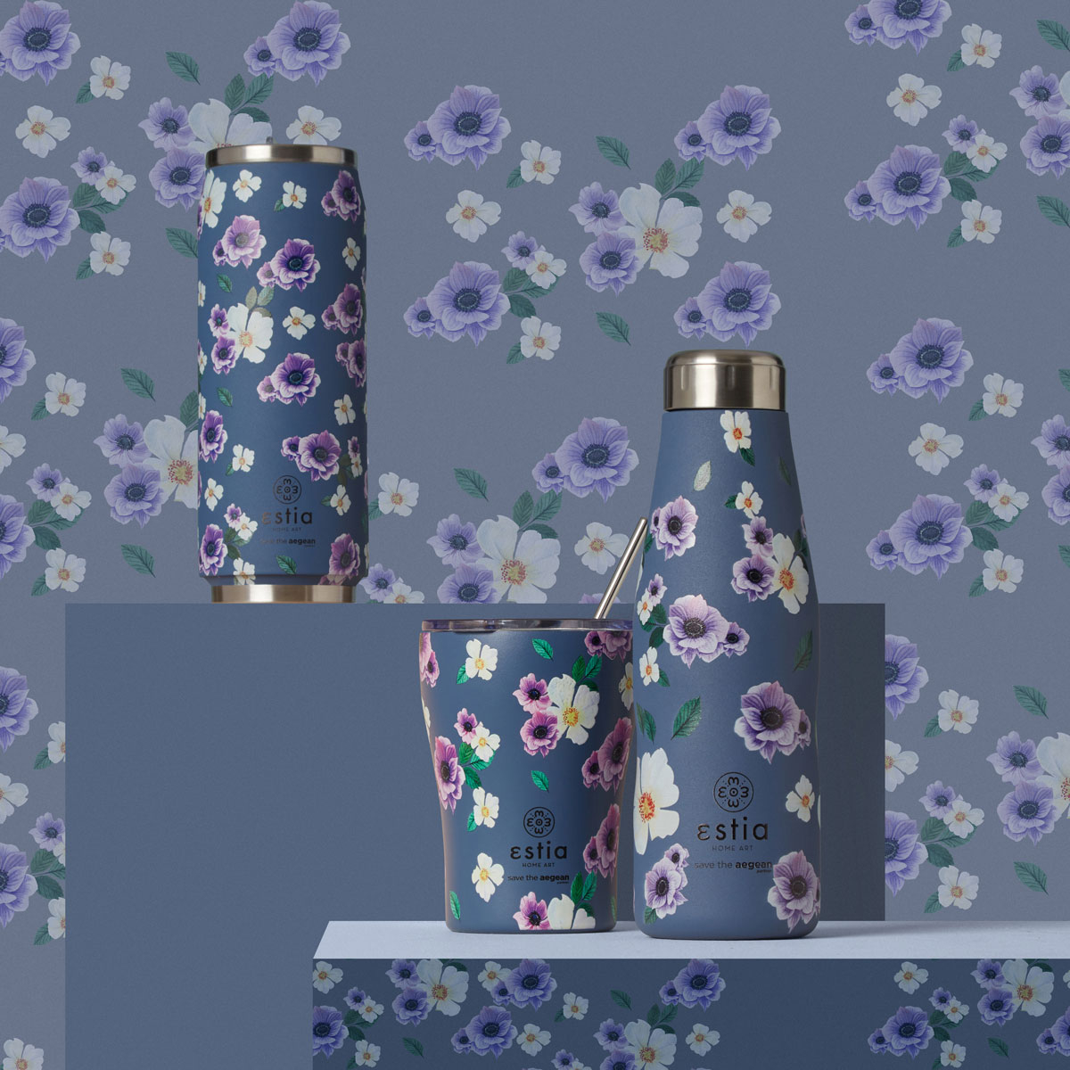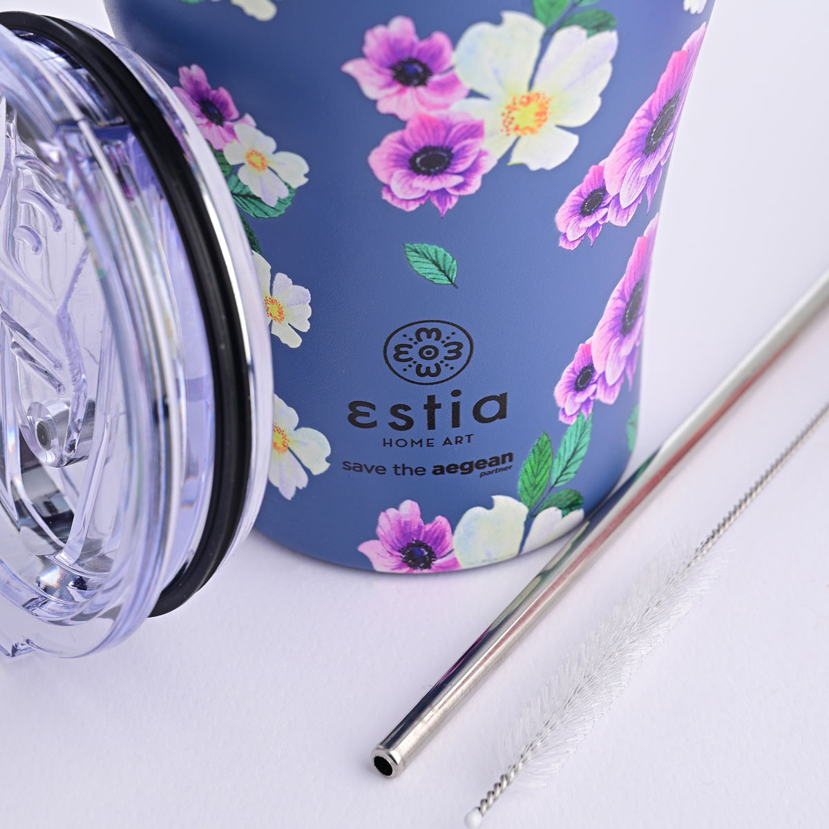 Θερμός της εταιρείας εstia με μπλε φόντο, μωβ-λευκές λεπτομέρειες και φλοράλ σχέδιο από την σειρά "Save The Aegean". Η εταιρεία εstia συνεισφέρει στον οργανισμό "Save The Aegean" με 1% επί των πωλήσεων, για καθαρότερες θάλασσες και ένα καλύτερο αύριο. Άριστη ποιότητα κατασκευής από ανοξείδωτο ατσάλι 18/8 που ανταποκρίνεται σε υψηλές απαιτήσεις, εγγυάται μεγαλύτερη αντοχή στη μακροχρόνια χρήση και 100% αναλλοίωτη γεύση των υγρών. Το προϊόν είναι απαλλαγμένο από ουσίες BPA και είναι ασφαλές για επαφή με τρόφιμα και υγρά. Το διπλό τοίχωμα διατηρεί τα υγρά 12 ώρες κρύα και 6 ώρες ζεστά. Το καπάκι του προσφέρει 100% στεγανότητα στα κρύα ροφήματα και spill proof προστασία στα ζεστά ενώ διαθέτει πρακτική οπή για να τοποθετήσετε το ανοξείδωτο καλαμάκι που περιλαμβάνεται. Το χρώμα τοποθετείται μέσω της αποτελεσματικότερης τεχνικής powder coating, η οποία προσφέρει ένα ματ αποτέλεσμα και μεγάλη αντοχή στην μακροχρόνια χρήση. Ιδανικό για την βόλτα, το ταξίδι, το γραφείο. Χωράει στις ποτηροθήκες των περισσότερων αυτοκινήτων για να το μεταφέρετε εύκολα σε κάθε διαδρομή σας. Το λογότυπο είναι χαραγμένο πάνω στο προϊόν. Η συσκευασία του είναι κατασκευασμένη από 100% ανακυκλώσιμα υλικά και μπορεί να χρησιμοποιηθεί για πολλαπλές χρήσεις. Συμπεριλαμβάνεται ανοξείδωτο καλαμάκι.