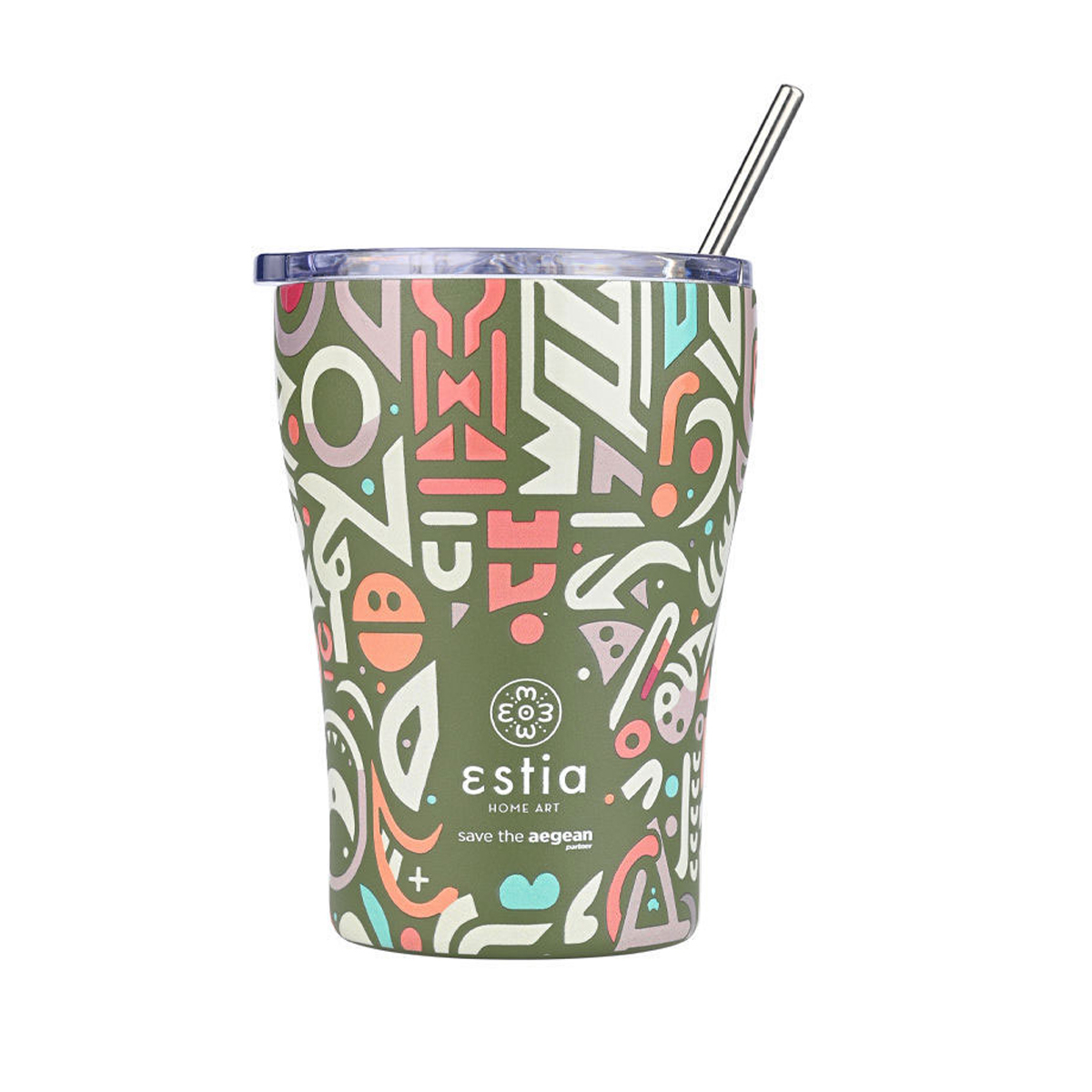 Ποτήρι θερμός 350ml από την εταιρεία εstia σε χακί χρώμα με πολύχρωμο μοντέρνο σχέδιο. Είναι μέρος της συλλογής "Save The Aegean". Η εταιρεία εstia συνεισφέρει στον οργανισμό "Save The Aegean" με 1% επί των πωλήσεων, για καθαρότερες θάλασσες και ένα καλύτερο αύριο. Είναι κατασκευασμένο από ανοξείδωτο ατσάλι 18/8 που ανταποκρίνεται σε υψηλές απαιτήσεις, εγγυάται μεγαλύτερη αντοχή στη μακροχρόνια χρήση και 100% αναλλοίωτη γεύση των υγρών. Το προϊόν είναι απαλλαγμένο από ουσίες BPA και είναι ασφαλές για επαφή με τρόφιμα και υγρά. H ενισχυμένη μόνωση διπλού τοιχώματος διατηρεί κρύο έως 12 ώρες και ζεστό έως 6 ώρες το ρόφημα, με τη θερμοκρασία του εξωτερικού τοιχώματος να παραμένει σταθερή. Έχει άνετο κράτημα καθώς δεν «ιδρώνει». Το καπάκι είναι 100% στεγανό ώστε να αποφεύγονται οι διαρροές. Το χρώμα τοποθετείται μέσω της τεχνικής powder coating, η οποία προσφέρει ένα ματ αποτέλεσμα και μεγάλη αντοχή στην μακροχρόνια χρήση. Ιδανικό για την βόλτα, το ταξίδι, το γραφείο. Το λογότυπο είναι χαραγμένο πάνω στο προϊόν. Η συσκευασία του είναι κατασκευασμένη από 100% ανακυκλώσιμα υλικά και μπορεί να χρησιμοποιηθεί για πολλαπλές χρήσεις.