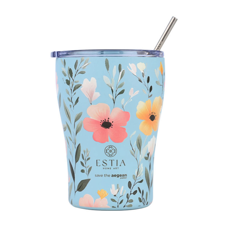Ποτήρι θερμός 350ml από την εταιρεία εstia σε γαλάζιο φόντο με πολύχρωμο φλοράλ σχέδιο. Είναι μέρος της συλλογής "Save The Aegean". Η εταιρεία εstia συνεισφέρει στον οργανισμό "Save The Aegean" με 1% επί των πωλήσεων, για καθαρότερες θάλασσες και ένα καλύτερο αύριο. Είναι κατασκευασμένο από ανοξείδωτο ατσάλι 18/8 που ανταποκρίνεται σε υψηλές απαιτήσεις, εγγυάται μεγαλύτερη αντοχή στη μακροχρόνια χρήση και 100% αναλλοίωτη γεύση των υγρών. Το προϊόν είναι απαλλαγμένο από ουσίες BPA και είναι ασφαλές για επαφή με τρόφιμα και υγρά. H ενισχυμένη μόνωση διπλού τοιχώματος διατηρεί κρύο έως 12 ώρες και ζεστό έως 6 ώρες το ρόφημα, με τη θερμοκρασία του εξωτερικού τοιχώματος να παραμένει σταθερή. Έχει άνετο κράτημα καθώς δεν «ιδρώνει». Το καπάκι είναι 100% στεγανό ώστε να αποφεύγονται οι διαρροές. Η βαφή έχει επίστρωση πούδρας, η οποία προσφέρει ένα ματ αποτέλεσμα και μεγάλη αντοχή στην μακροχρόνια χρήση. Ιδανικό για την βόλτα, το ταξίδι, το γραφείο. Το λογότυπο είναι χαραγμένο πάνω στο προϊόν. Η συσκευασία του είναι κατασκευασμένη από 100% ανακυκλώσιμα υλικά και μπορεί να χρησιμοποιηθεί για πολλαπλές χρήσεις.