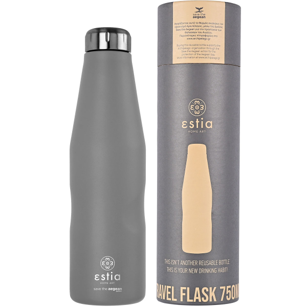 Θερμός της εταιρείας εstia από την σειρά "Save The Aegean". Η εταιρεία εstia συνεισφέρει στον οργανισμό "Save The Aegean" με 1% επί των πωλήσεων, για καθαρότερες θάλασσες και ένα καλύτερο αύριο. Άριστη ποιότητα κατασκευής από ανοξείδωτο ατσάλι 18/10 που ανταποκρίνεται σε υψηλές απαιτήσεις, εγγυάται μεγαλύτερη αντοχή στη μακροχρόνια χρήση και 100% αναλλοίωτη γεύση των υγρών. Το προϊόν είναι απαλλαγμένο από ουσίες BPA και είναι ασφαλές για επαφή με τρόφιμα και υγρά. Το διπλό τοίχωμα διατηρεί τα υγρά 12 ώρες κρύα και 6 ώρες ζεστά. Ασφαλίζει άριστα και είναι 100% leak proof. Το γκρι χρώμα τοποθετείται μέσω της αποτελεσματικότερης τεχνικής powder coating, η οποία προσφέρει ένα σαγρέ αποτέλεσμα και μεγάλη αντοχή στην μακροχρόνια χρήση. Το λογότυπο είναι χαραγμένο πάνω στο προϊόν. Η συσκευασία του είναι κατασκευασμένη από 100% ανακυκλώσιμα υλικά και μπορεί να χρησιμοποιηθεί για πολλαπλές χρήσεις. Συμπεριλαμβάνεται ειδικό βουρτσάκι για να καθαρίζεται εύκολα το εσωτερικό καλαμάκι.
