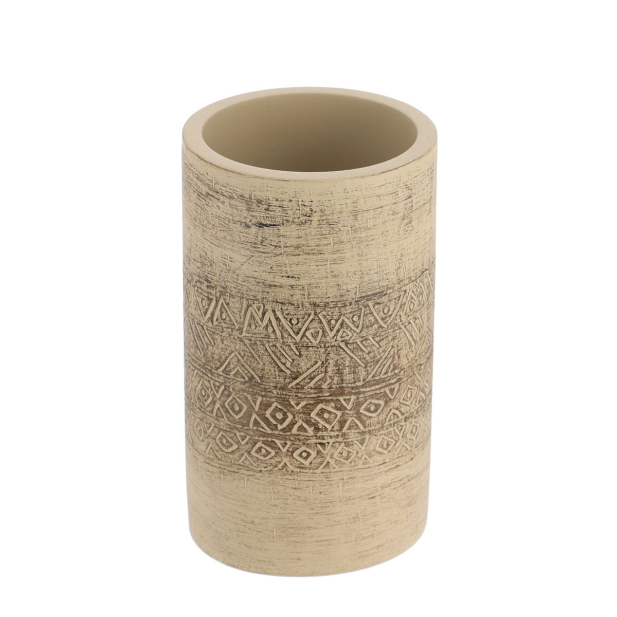 Ποτήρι μπάνιου για την οδοντόβουρτσα και την οδοντόκρεμα. Είναι κατασκευασμένο από τσιμέντο σε μπεζ χρώμα με έθνικ σχέδιο. Συνδυάστε το με τα υπόλοιπα είδη της ίδιας σειράς για ένα ολοκληρωμένο αποτέλεσμα στο μπάνιο σας.