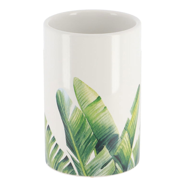 Ποτήρι μπάνιου για την οδοντόβουρτσα και την οδοντόκρεμα. Είναι κατασκευασμένο από κεραμικό υλικό σε λευκό χρώμα με πράσινο tropical σχέδιο. Συνδυάστε το με τα υπόλοιπα είδη της ίδιας σειράς για ένα ολοκληρωμένο αποτέλεσμα στο μπάνιο σας.