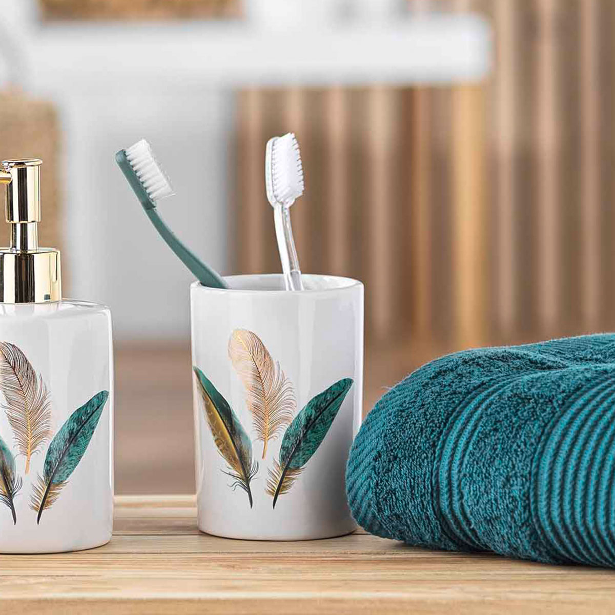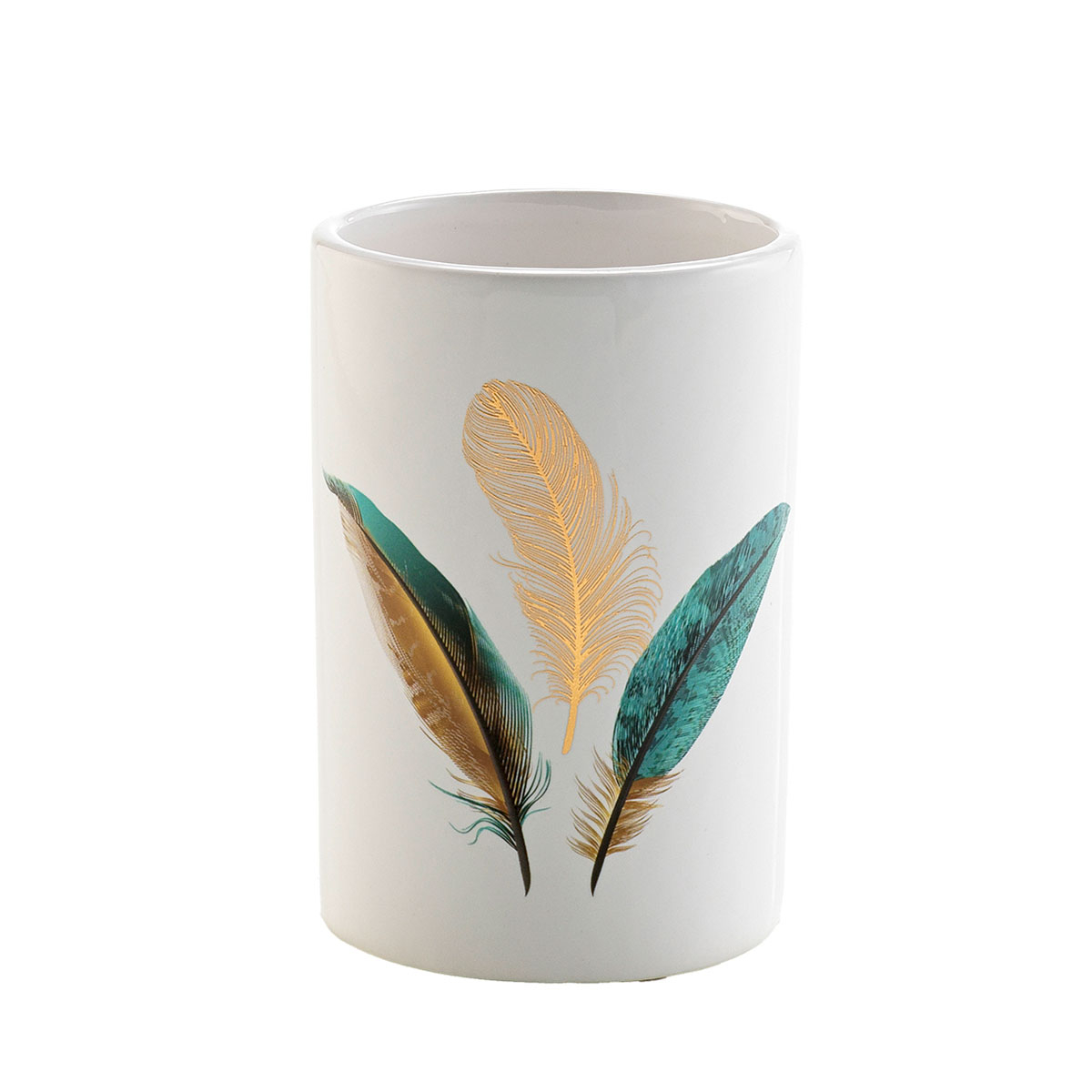 Ποτήρι οδοντόβουρτσας σε λευκό χρώμα με πετρόλ tropical σχέδιο. Είναι κατασκευασμένο από κεραμικό υλικό. Συνδυάστε το με τα υπόλοιπα προϊόντα της σειράς για ολοκληρωμένο αποτέλεσμα.