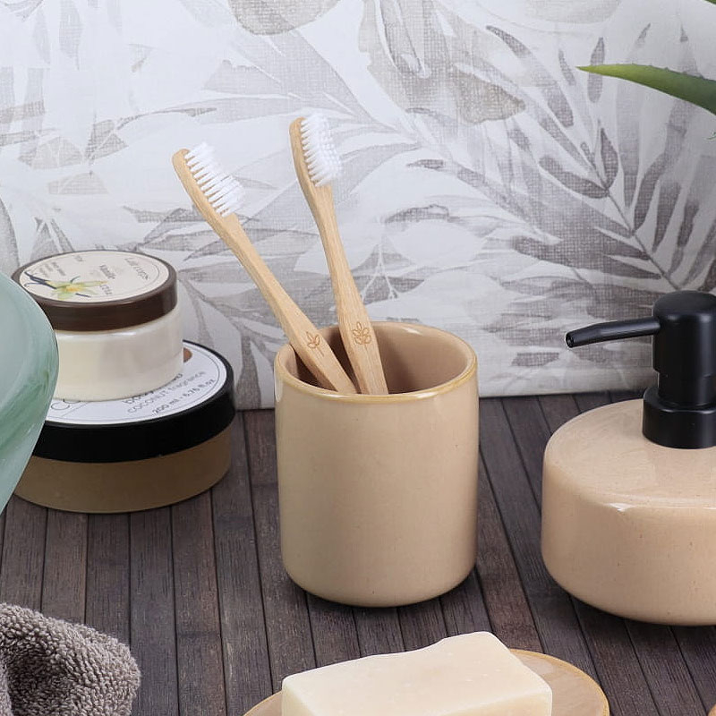 Ποτήρι μπάνιου για την οδοντόβουρτσα και την οδοντόκρεμα. Είναι κατασκευασμένο από κεραμικό υλικό σε μπεζ-καφέ χρώμα. Ιδανικό ποτήρι που θα ταιριάξει με όλα τα είδη διακόσμησης. Συνδυάστε το με τα υπόλοιπα είδη της ίδιας σειράς για ένα ολοκληρωμένο αποτέλεσμα στο μπάνιο σας.