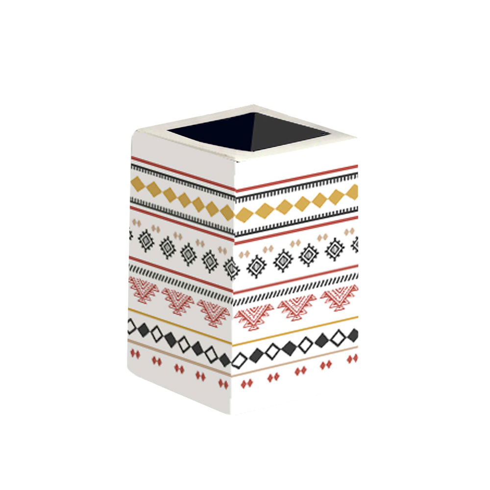 Κεραμικό ποτήρι για οδοντόβουρτσες για τοποθέτηση στο μπάνιο. Έχει λευκό φόντο με έθνικ λεπτομέρειες σε απόχρωση τερακότας, μουσταρδί και μαύρου. Συνδυάστε το με το δοχείο κρεμοσάπουνου και την σαπουνοθήκη για ολοκληρωμένο αποτέλεσμα.