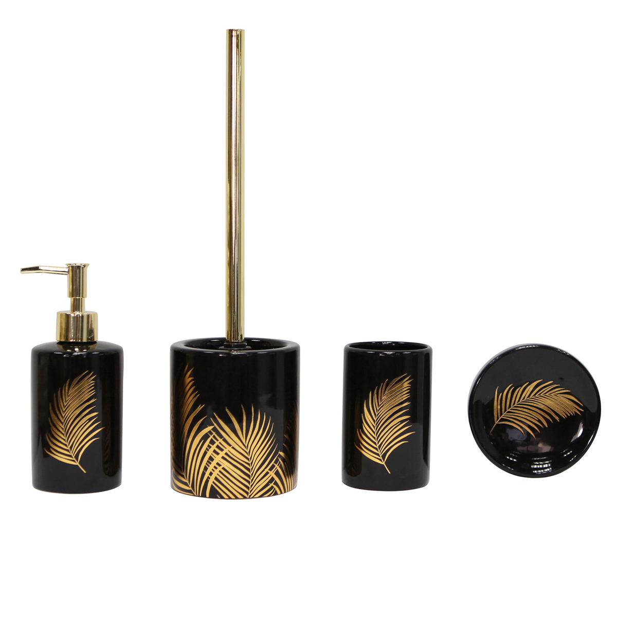 Κεραμικό ποτήρι για οδοντόβουρτσες για τοποθέτηση στο μπάνιο. Έχει μαύρο φόντο με χρυσό tropical σχέδιο. Συνδυάστε το με το δοχείο κρεμοσάπουνου και την σαπουνοθήκη για ολοκληρωμένο αποτέλεσμα.
