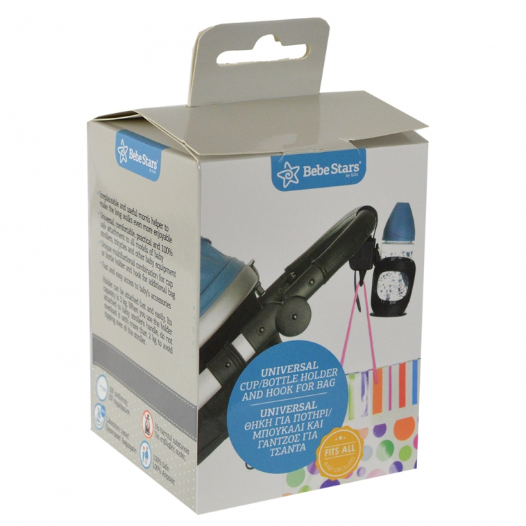 Ποτηροθήκη για βρεφικό καρότσι της εταιρείας Bebe Stars κατάλληλη για όλους τους τύπους καροτσιών. Μπορείτε να τοποθετήσετε μπιμπερό ή μπουκάλι με υγρό και να το μεταφέρετε με ασφάλεια και άνεση. Διαθέτει γάντζο για να κρεμάτε τσάντες.