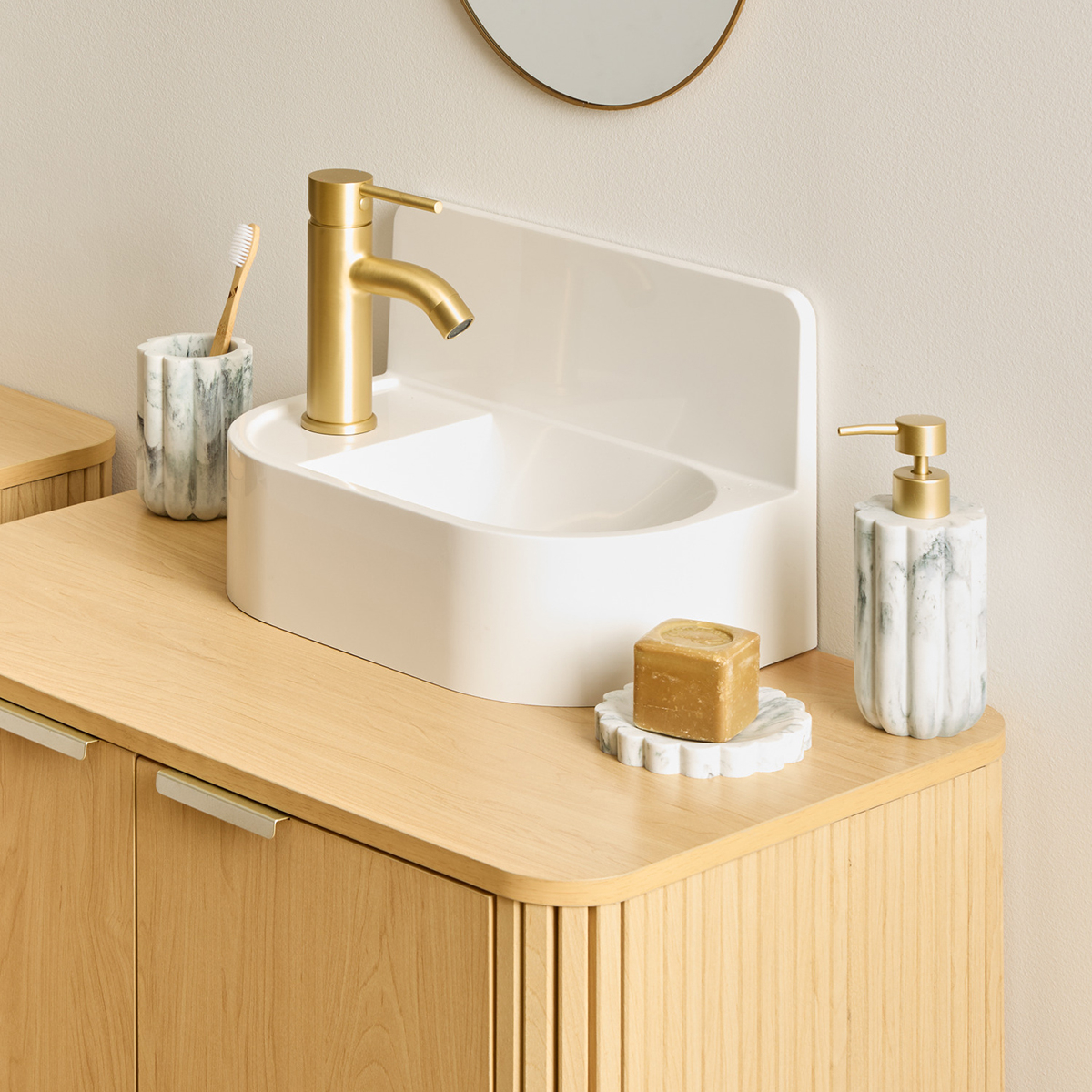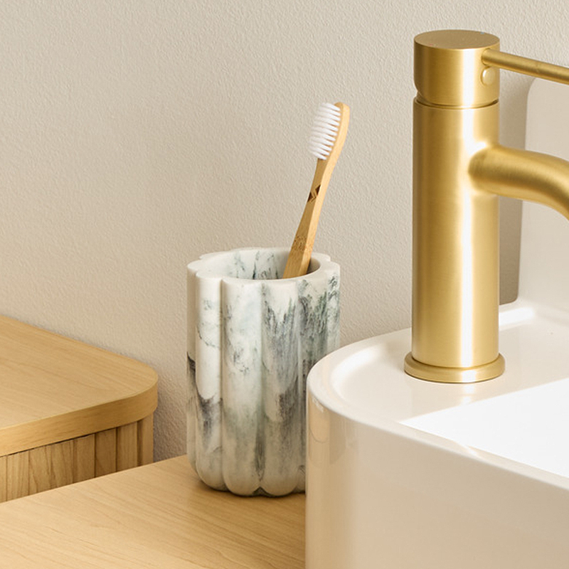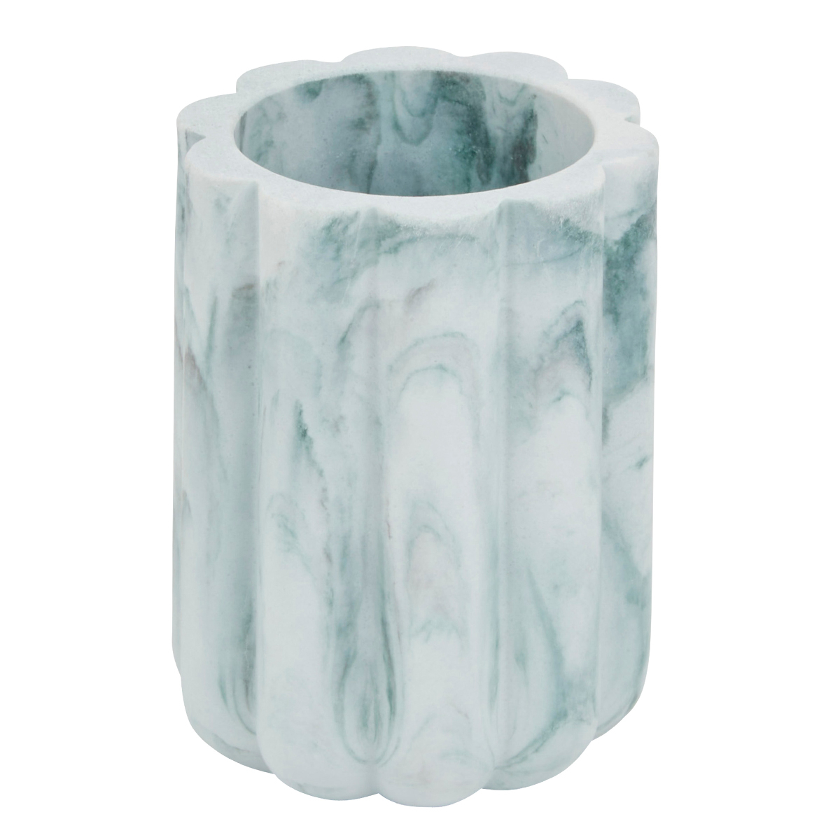 Ποτήρι οδοντόβουρτσας με μοντέρνο σχεδιασμό. Είναι κατασκευασμένο από polyresin υλικό σε λευκό χρώμα με εφέ μαρμάρου. Ιδανικό να ταιριάξει σε κάθε μπάνιο. Συνδυάστε το με τα υπόλοιπα προϊόντα του ίδιου σετ για ένα ολοκληρωμένο αποτέλεσμα.