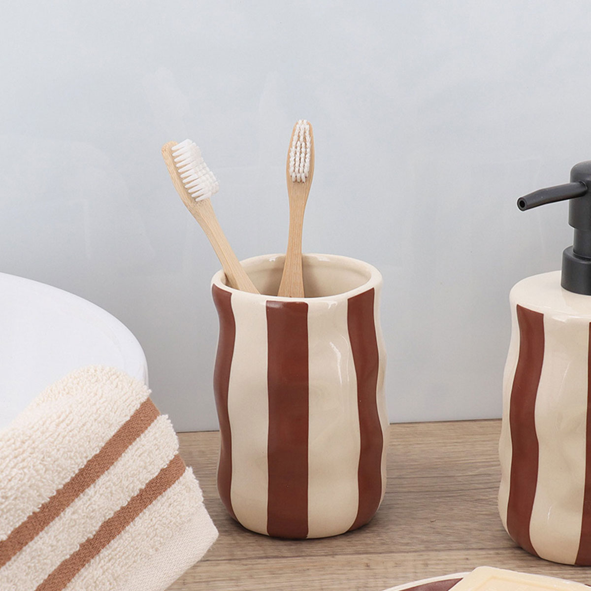 Ποτήρι μπάνιου για την οδοντόβουρτσα και την οδοντόκρεμα σε καφέ-εκρού χρώμα και ριγέ σχέδιο. Κατασκευασμένο από κεραμικό υψηλής ποιότητας Gres, που προσφέρει εξαιρετική αντοχή στην υγρασία και στη καθημερινή χρήση. Ιδανικό ποτήρι που θα ταιριάξει με όλα τα είδη διακόσμησης.