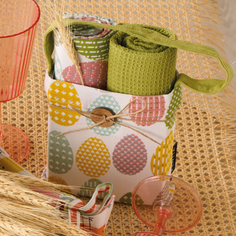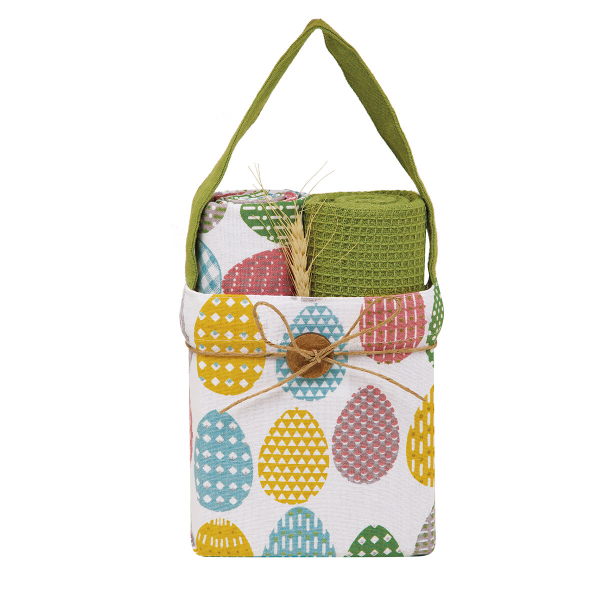 Ποτηρόπανα κουζίνας από την εταιρεία Kentia. Το ένα έχει μοντέρνο σχέδιο σε λευκό φόντο με πολύχρωμες λεπτομέρειες ενώ το άλλο είναι μονόχρωμο πράσινο. Η σύνθεση του υφάσματος είναι 100% βαμβάκι 200γραμ. /τ. μ. Χρησιμοποιήστε ποτηρόπανα και πετσέτες κουζίνας για να στεγνώσετε τα χέρια σας αλλά και τα πιάτα με ευκολία. Διαθέτουν πρακτική τσάντα με φλοράλ σχέδιο και πράσινη λαβή.