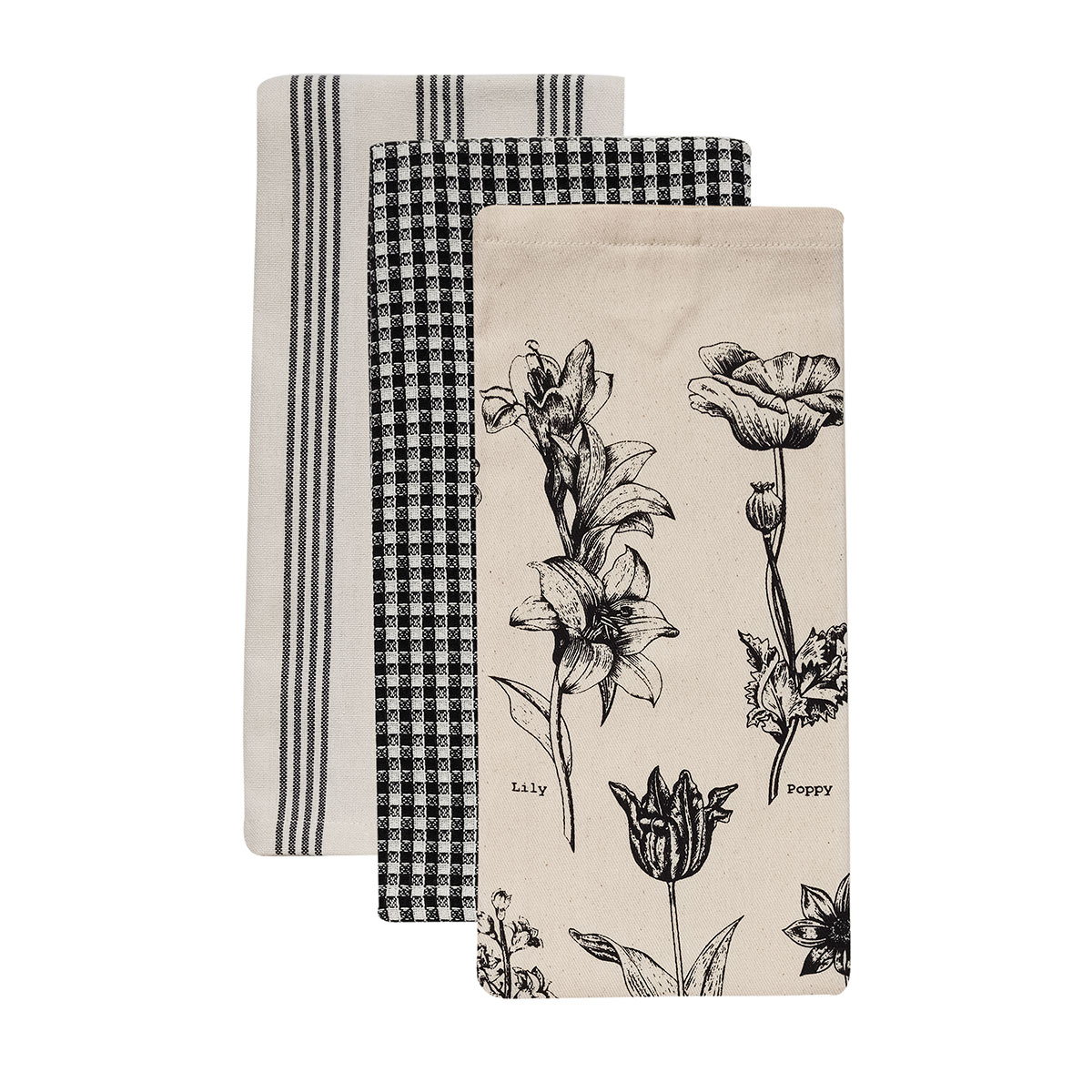 Σετ ποτηρόπανα κουζίνας 3 τεμάχια από την εταιρεία Kentia με διάφορα σχέδια σε εκρού-μαύρο χρώμα. Η σύνθεσή τους είναι 100% βαμβάκι βάρους 200γραμ. /τ. μ. που τα καθιστά απαλά και απορροφητικά. Στεγνώνουν γρήγορα και δεν αφήνουν χνούδια για να μπορείτε εύκολα να στεγνώνετε τα πιάτα και τα ποτήρια σας.