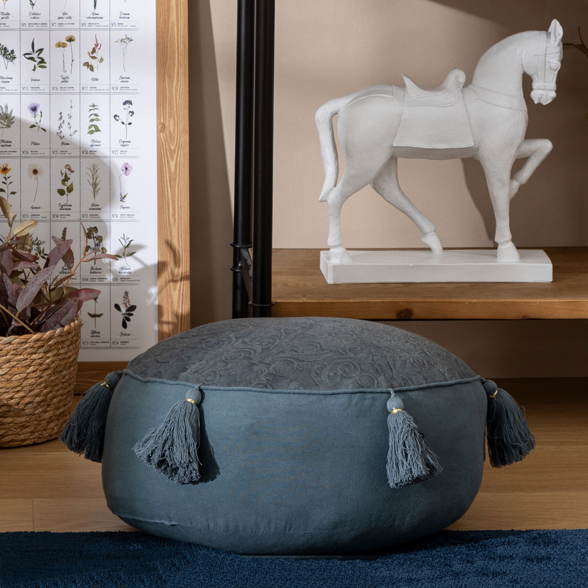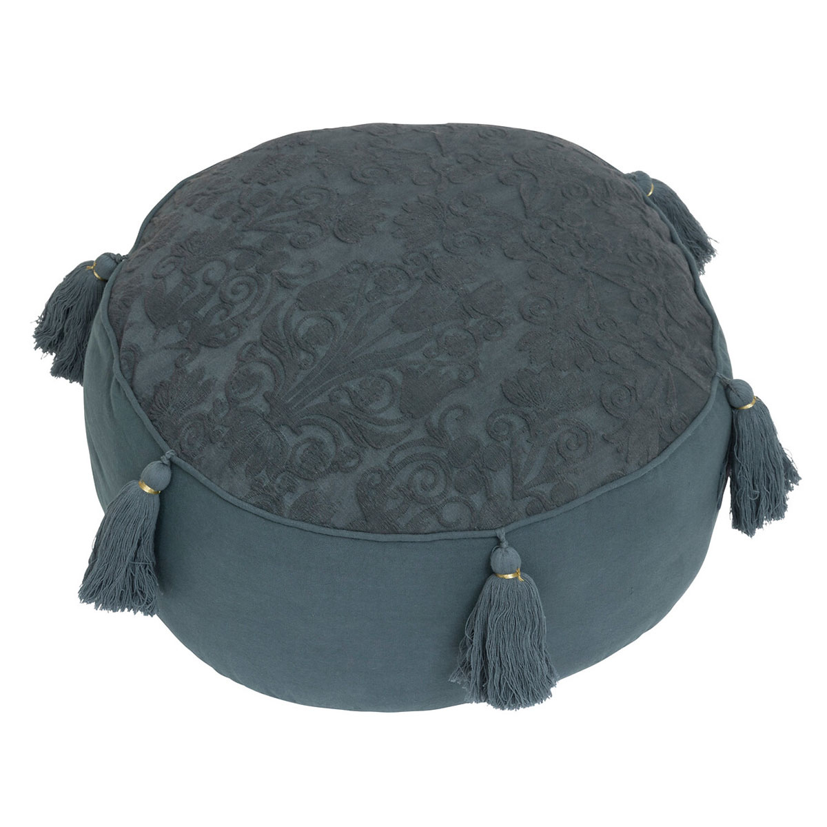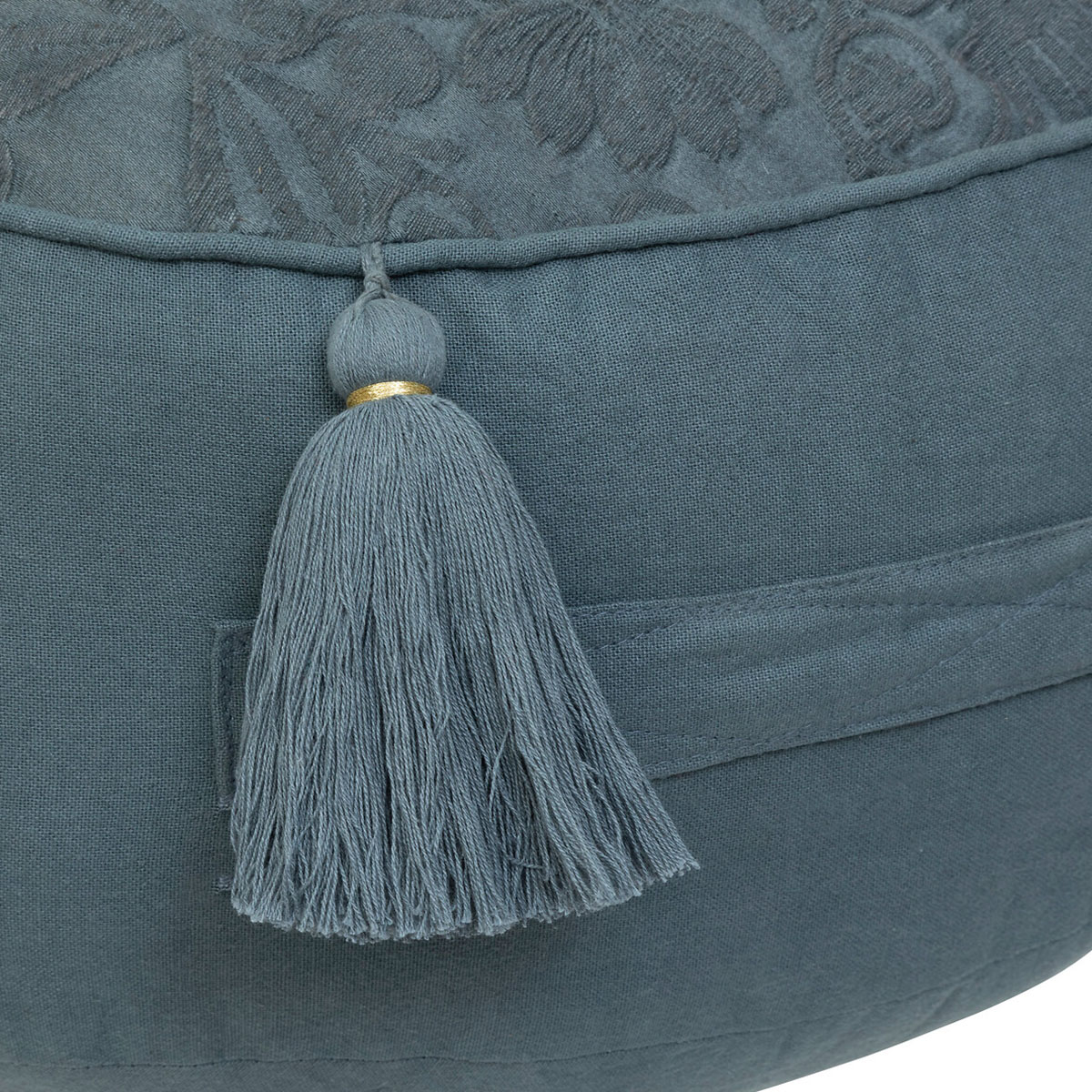 Πουφ σε μπλε χρώμα με jacquard ύφανση. Είναι κατασκευασμένο από βαμβάκι ενώ η γέμιση είναι από πολυεστερική βάτα. Διαθέτει λαβή για εύκολη μεταφορά και διακοσμητικά φουντάκια. Ιδανικό για να δημιουργήσετε στο χώρο σας μία έξτρα θέση ή να χαρίσετε αίσθηση χαλαρότητας και άνεσης.