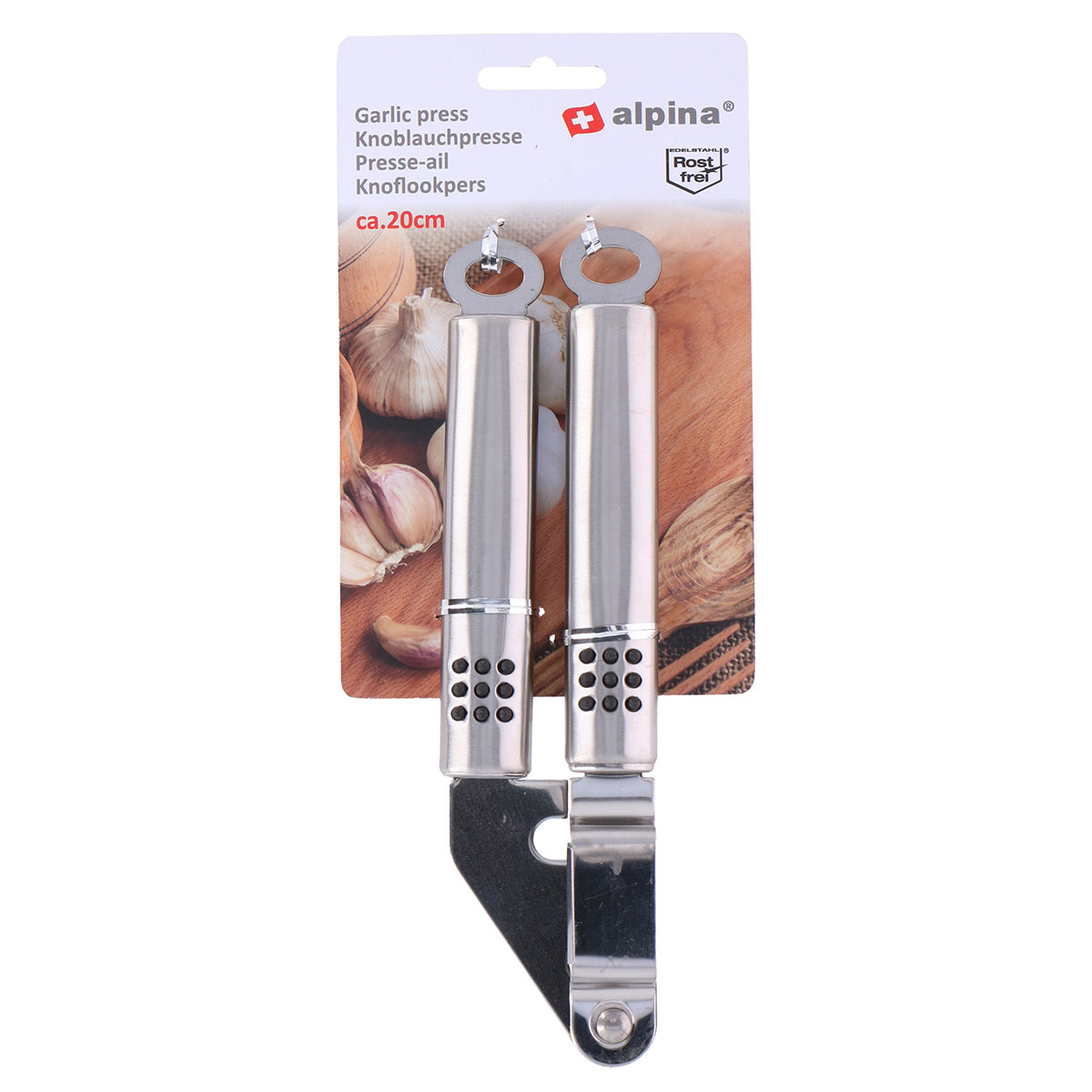 Πρέσα για σκόρδα από την εταιρία Alpina. Είναι κατασκευασμένη από ανοξείδωτο ατσάλι σε ασημί χρώμα. Διαθέτει θηλιά για να κρεμιέται. Ιδανικό εργαλείο για κάθε κουζίνα.