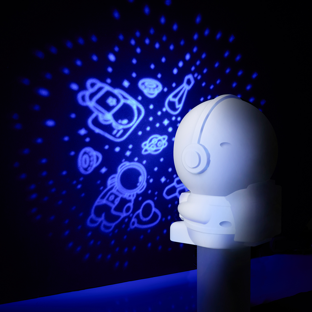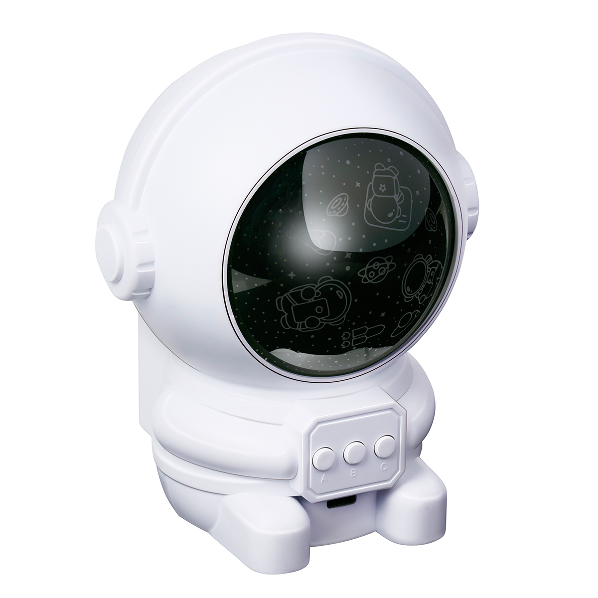 Περιστρεφόμενος προτζέκτορας με φως της εταιρείας Grundig. Είναι κατασκευασμένος από πλαστικό ABS σε λευκό χρώμα με σχήμα αστροναύτη. Προβάλει αστέρια και αστροναύτες στο ταβάνι και τους τοίχους. Διαθέτει πολύχρωμο φωτισμό RGB. Έχει κουμπιά για να επιλέξετε χρωματισμό και θύρα USB C για να συνδέσετε το περιλαμβανόμενο καλώδιο. Μπορεί να λειτουργήσει και με 3 μπαταρίες ΑΑΑ, οι οποίες δεν περιλαμβάνονται. Ιδανικός προβολέας για το παιδικό ή βρεφικό δωμάτιο.