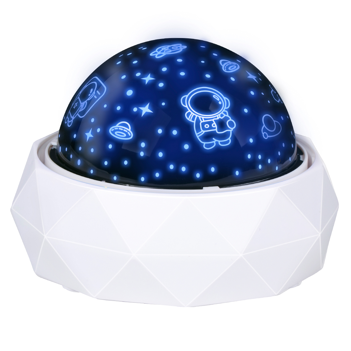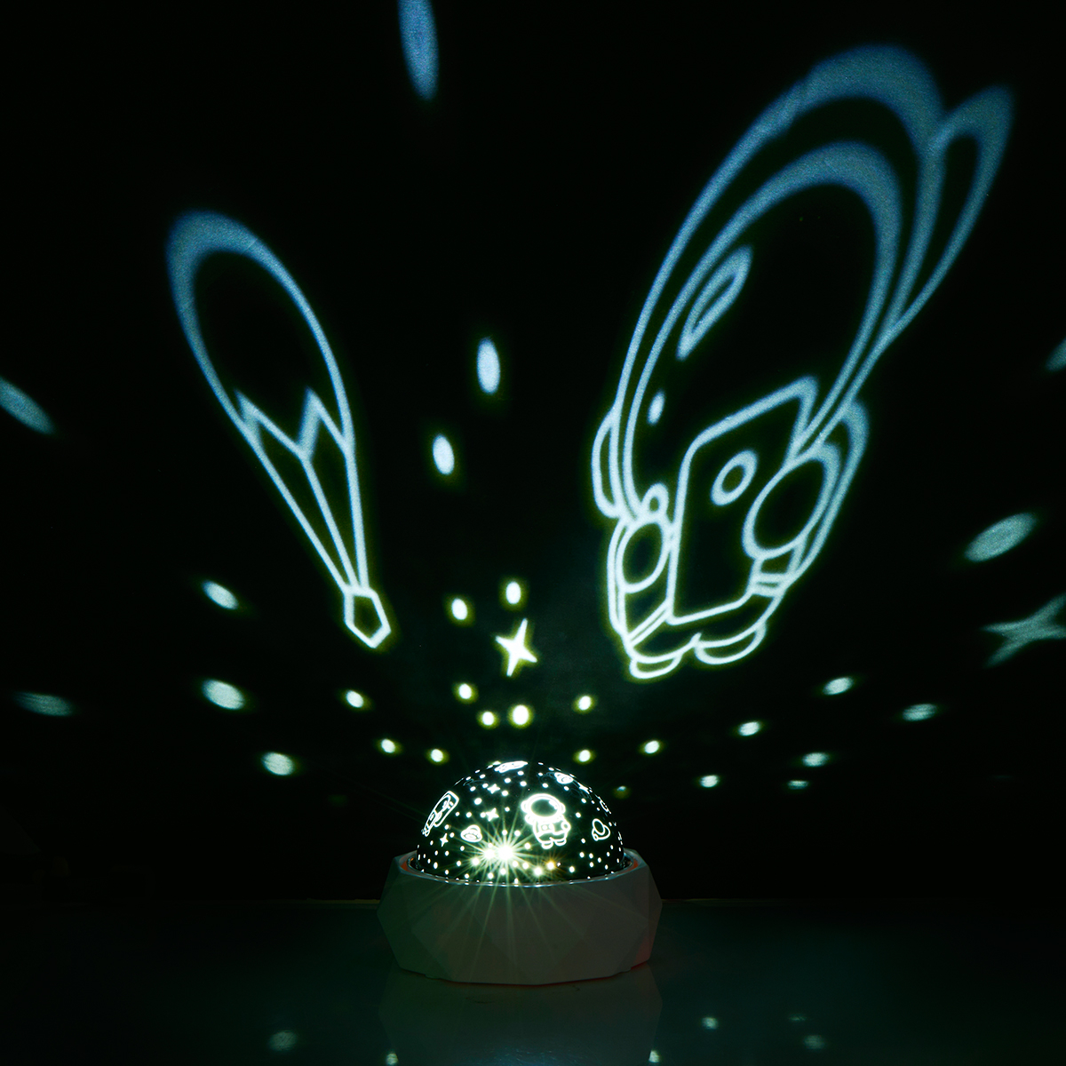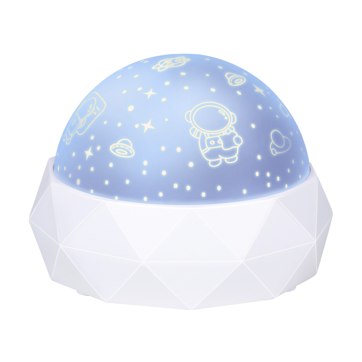 Περιστρεφόμενος προτζέκτορας με φως της εταιρείας Grundig. Είναι κατασκευασμένος από πλαστικό ABS σε λευκό χρώμα. Προβάλει αστέρια και αστροναύτες στο ταβάνι και τους τοίχους. Διαθέτει πολύχρωμο φωτισμό RGB. Στο πίσω μέρος διαθέτει κουμπί On/Off και θύρα USB C για να συνδέσετε το περιλαμβανόμενο καλώδιο. Ιδανικός προβολέας για το παιδικό ή βρεφικό δωμάτιο.