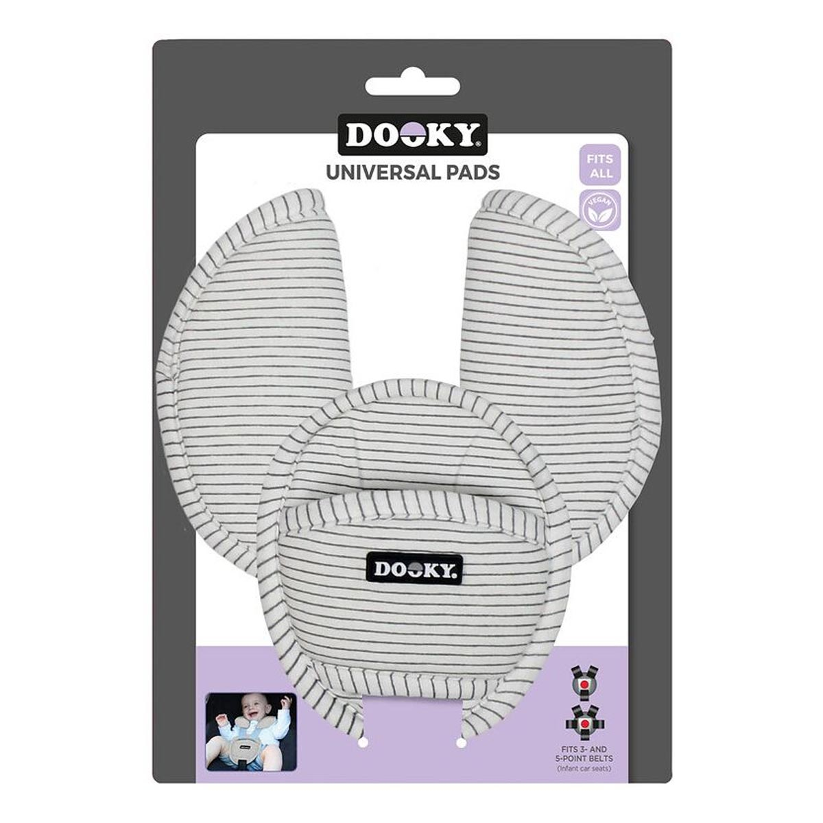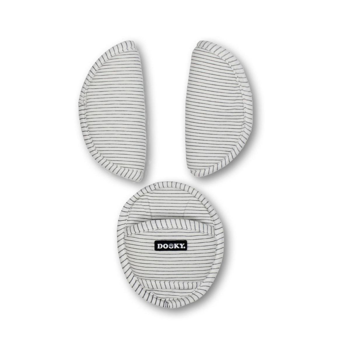 Προστατευτικά μαξιλαράκια ζώνης σε γκρι χρώμα και ριγέ σχέδιο από την εταιρία Dooky. Είναι κατασκευασμένα από 100% βαμβάκι και είναι vegan (δεν χρησιμοποιήθηκαν ζωικές ουσίες) . Ταιριάζουν σε όλα τα μοντέλα και μάρκες καθισμάτων αυτοκινήτου για ηλικίες 0+ μηνών αλλά και στις ζώνες 3 και 5 σημείων. Προσαρμόζεται εύκολα με ταινία velcro. Το σετ περιλαμβάνει 2 μαξιλαράκια για τα λουριά της ζώνης και ένα για την θέση του κουμπώματος. Ιδανικό σετ για να προστατεύει το μωρό σας από βρώμικες ή φθαρμένες ζώνες αυτοκινήτου ή και καροτσιών και παράλληλα να μην το τραυματίζει.