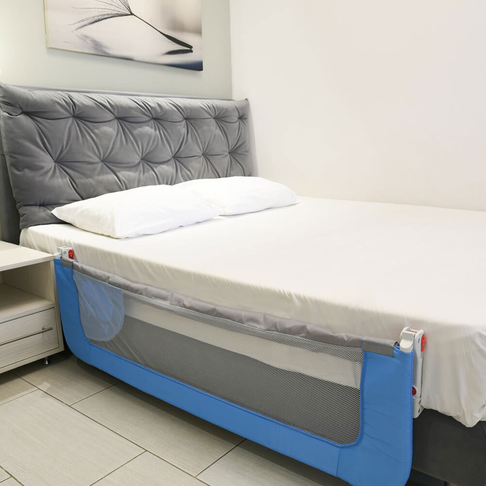 Προστατευτικό κάγκελο κρεβατιού σε μπλε αποχρώσεις από την εταιρεία Bebe Stars. Είναι απαραίτητο για το παιδί όταν αρχίζει να κοιμάται σε κρεβάτι χωρίς πλευρικά κάγκελα. Είναι ασφαλές, πρακτικό και αποτρέπει την πτώση από το κρεβάτι κατά τη διάρκεια του ύπνου. Στερεώνεται εύκολα κάτω από το στρώμα και ανοίγει μέσω του μηχανισμού αναδίπλωσης για να βγει το παιδί. Μπορείτε να ρυθμίσετε το ύψος του ώστε να ταιριάζει σε κάθε κρεβάτι και στρώμα. Κλείνει και αποθηκεύεται εύκολα. Κατασκευασμένο σύμφωνα με τις Ευρωπαϊκές προδιαγραφές ΕΝ 716, BS7972.