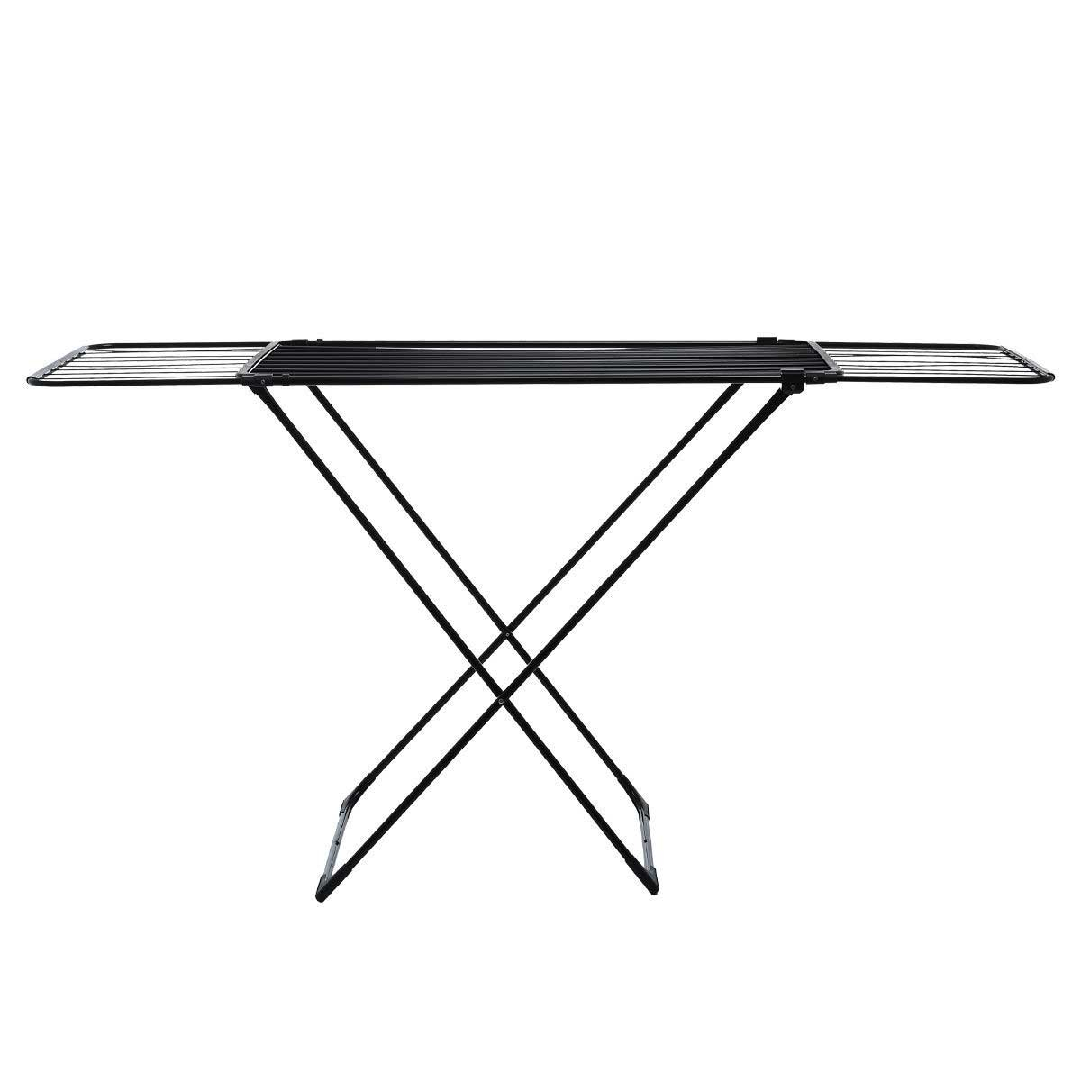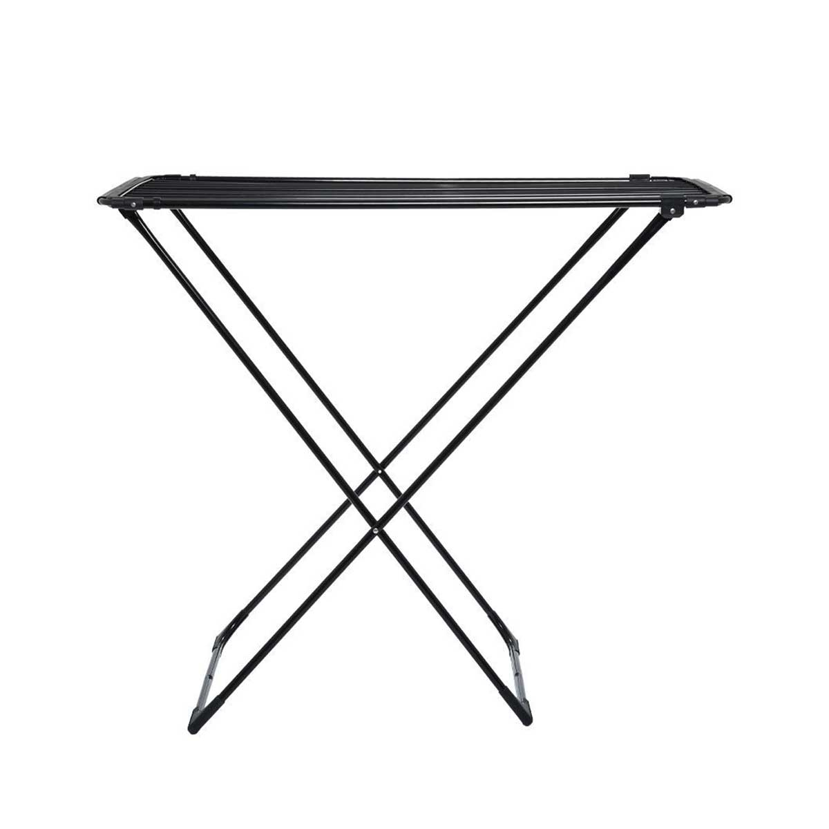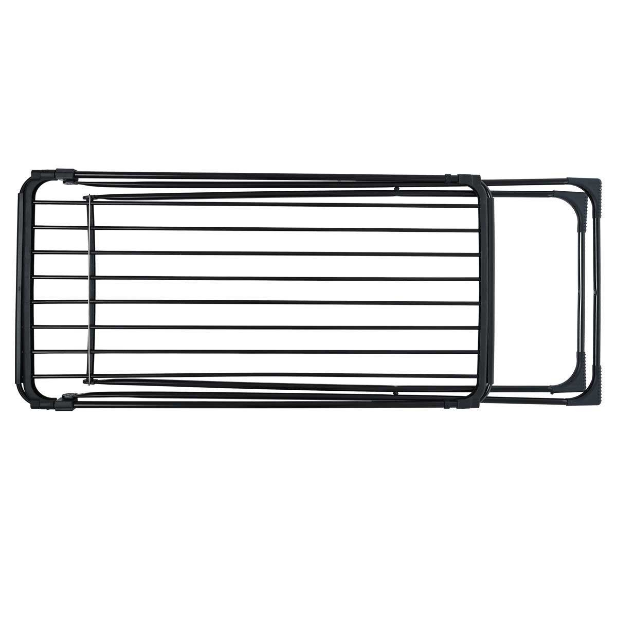 Πτυσσόμενη απλώστρα δαπέδου από την εταιρεία εstia σε μαύρο χρώμα. Είναι κατασκευασμένη από μεταλλικό υλικό. Διπλώνει ώστε να αποθηκεύεται εύκολα όταν δεν την χρησιμοποιείτε και έχει αντιολισθητική επένδυση στα άκρα. Το συνολικό μήκος από τις ράγες αντιστοιχεί σε 18 μέτρα απλώματος.