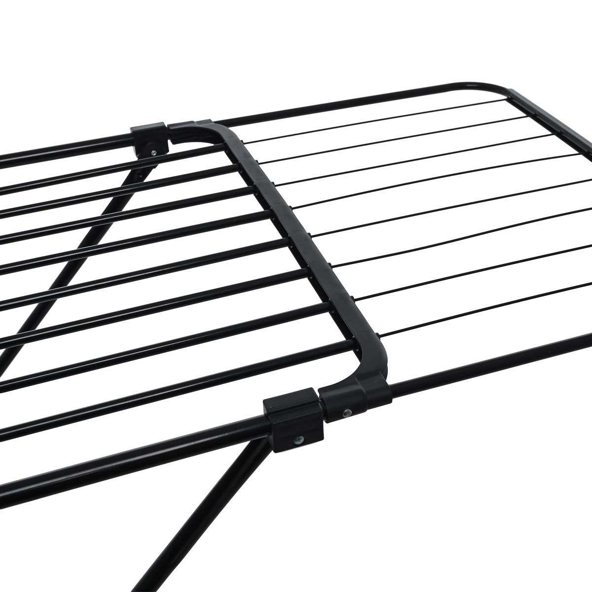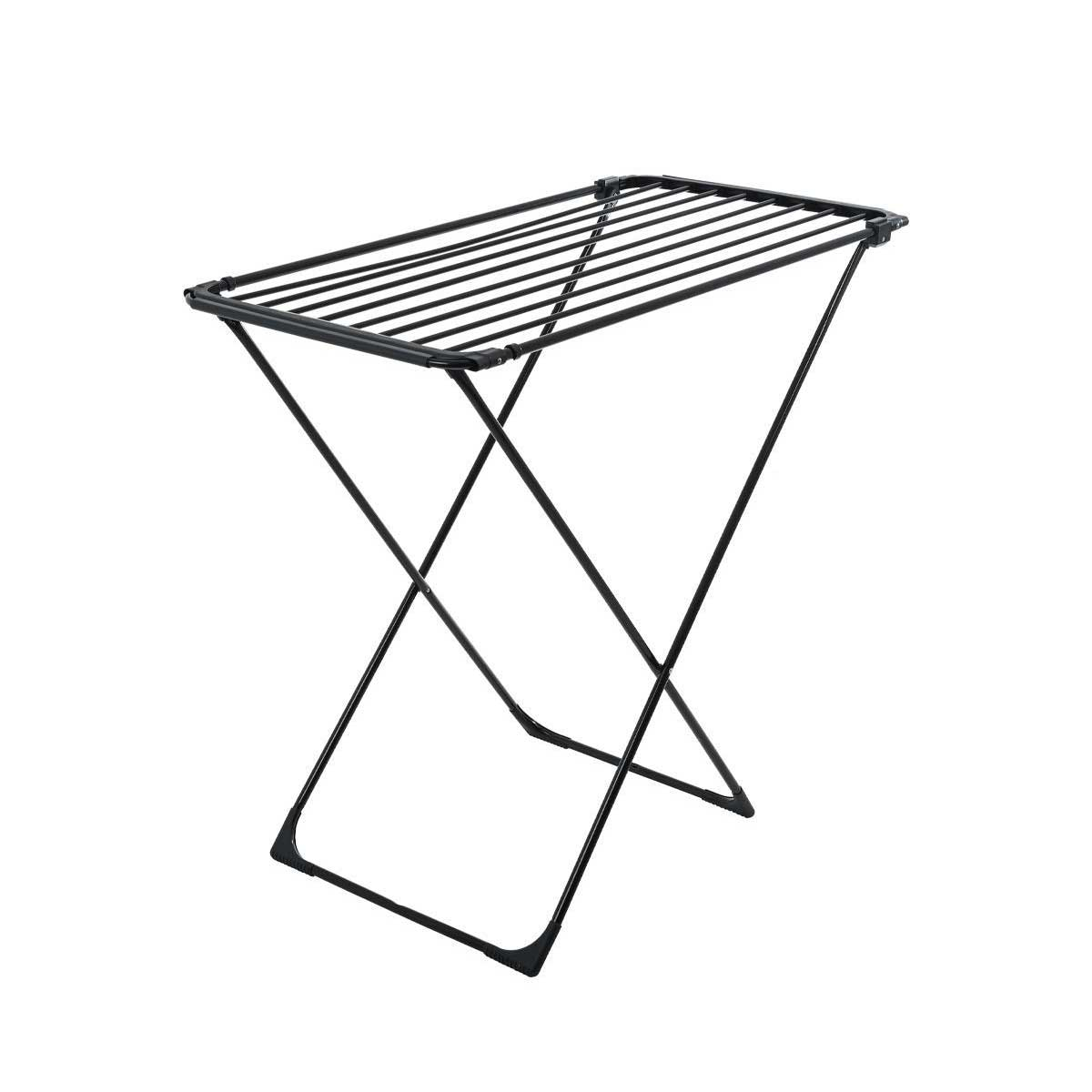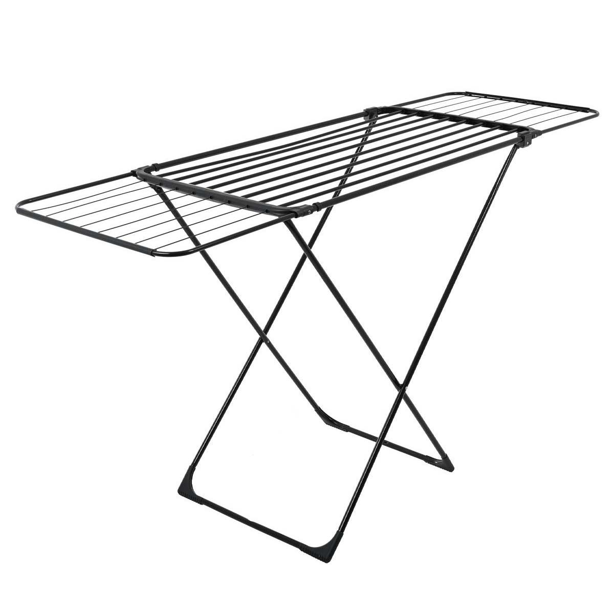Πτυσσόμενη απλώστρα δαπέδου από την εταιρεία εstia σε μαύρο χρώμα. Είναι κατασκευασμένη από μεταλλικό υλικό. Διπλώνει ώστε να αποθηκεύεται εύκολα όταν δεν την χρησιμοποιείτε και έχει αντιολισθητική επένδυση στα άκρα. Το συνολικό μήκος από τις ράγες αντιστοιχεί σε 18 μέτρα απλώματος.