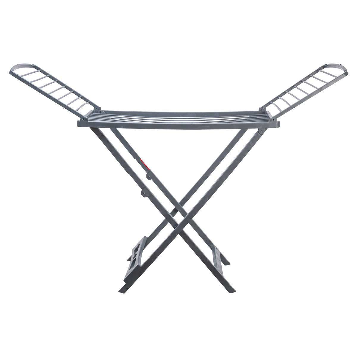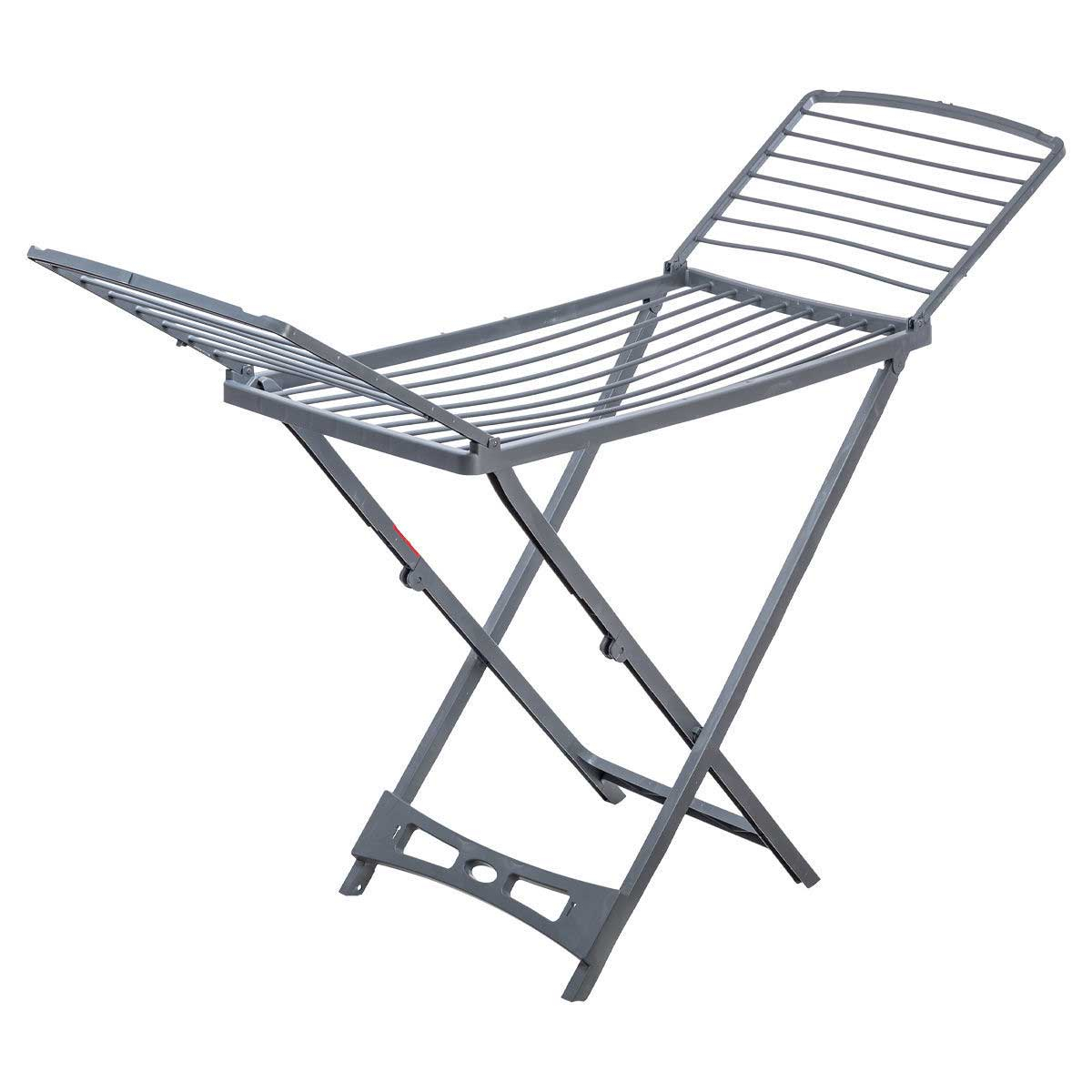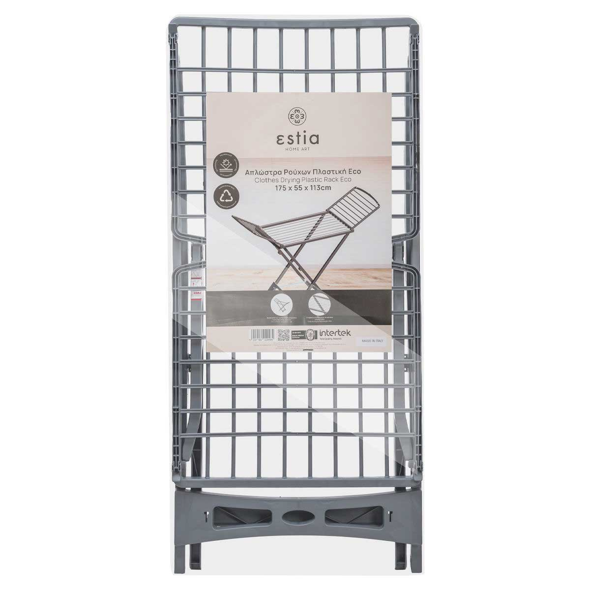 Πτυσσόμενη απλώστρα δαπέδου από την εταιρεία εstia σε γκρι χρώμα. Είναι κατασκευασμένη από ανακυκλωμένο πλαστικό. Διπλώνει ώστε να αποθηκεύεται εύκολα όταν δεν την χρησιμοποιείτε. Το συνολικό μήκος από τις ράγες αντιστοιχεί σε 20 μέτρα απλώματος.