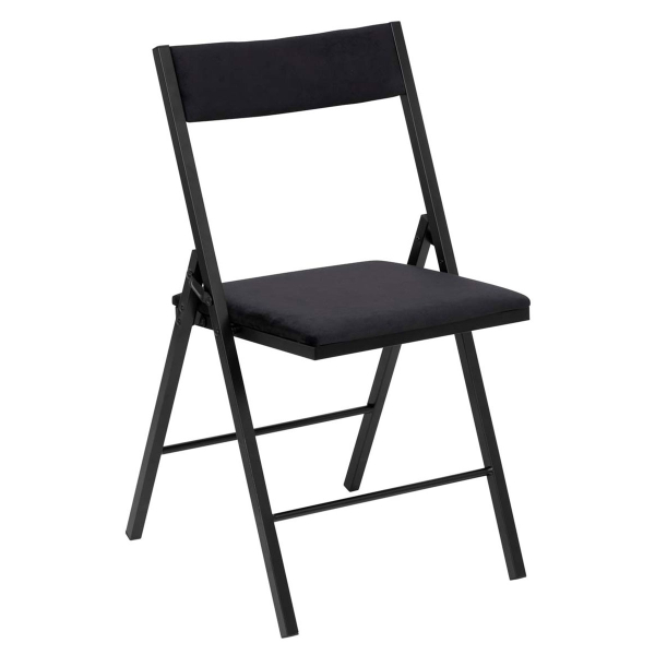 Πτυσσόμενη καρέκλα που θα ταιριάξει μοναδικά στο σπιτι σας. Είναι κατασκευασμένη από μεταλλικό υλικό σε μαύρο χρώμα με βελουτέ μαύρη επένδυση και μαξιλάρι αφρού πολυουρεθάνης. Είναι αναδιπλούμενη για εξοικονόμηση χώρου, μεταφορά και αποθήκευση. *Το προϊόν έρχεται μονταρισμένο.*