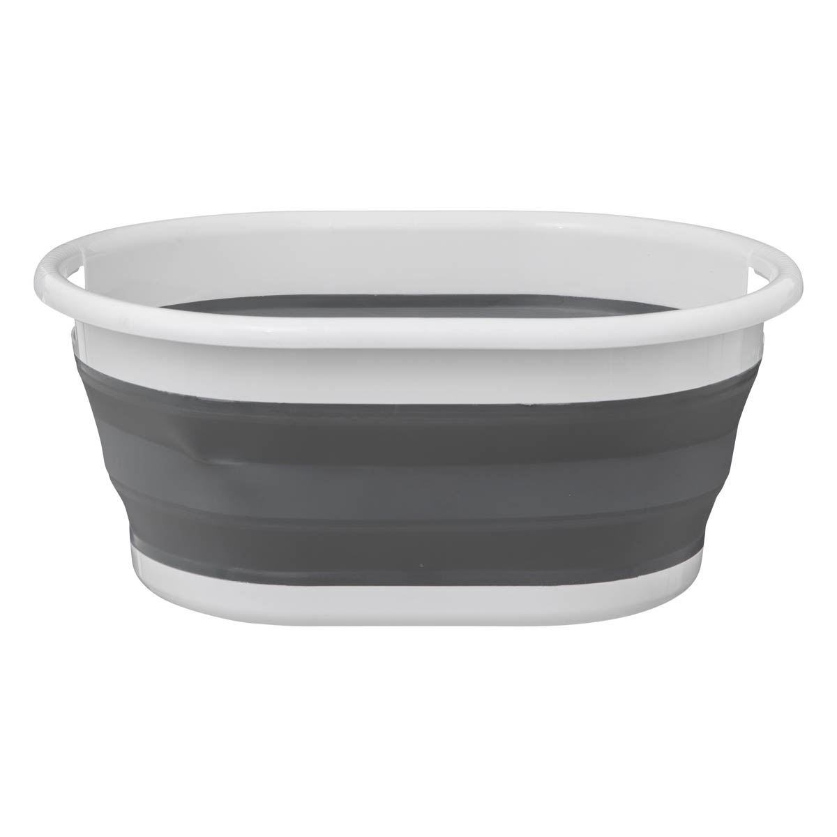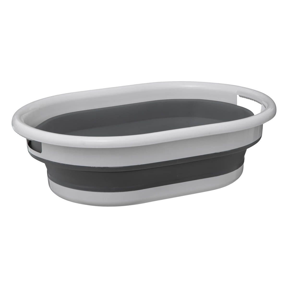 Λεκάνη πλυσίματος από σιλικόνη και πλαστικό υλικό σε γκρι και λευκό χρώμα. Είναι πτυσσόμενη με πολύ μικρό ύψος όταν είναι κλειστή, για να αποθηκεύεται εύκολα χωρίς να πιάνει χώρο. Ιδανική για την μεταφορά και το άπλωμα των ρούχων. Χωρητικότητα 21L.