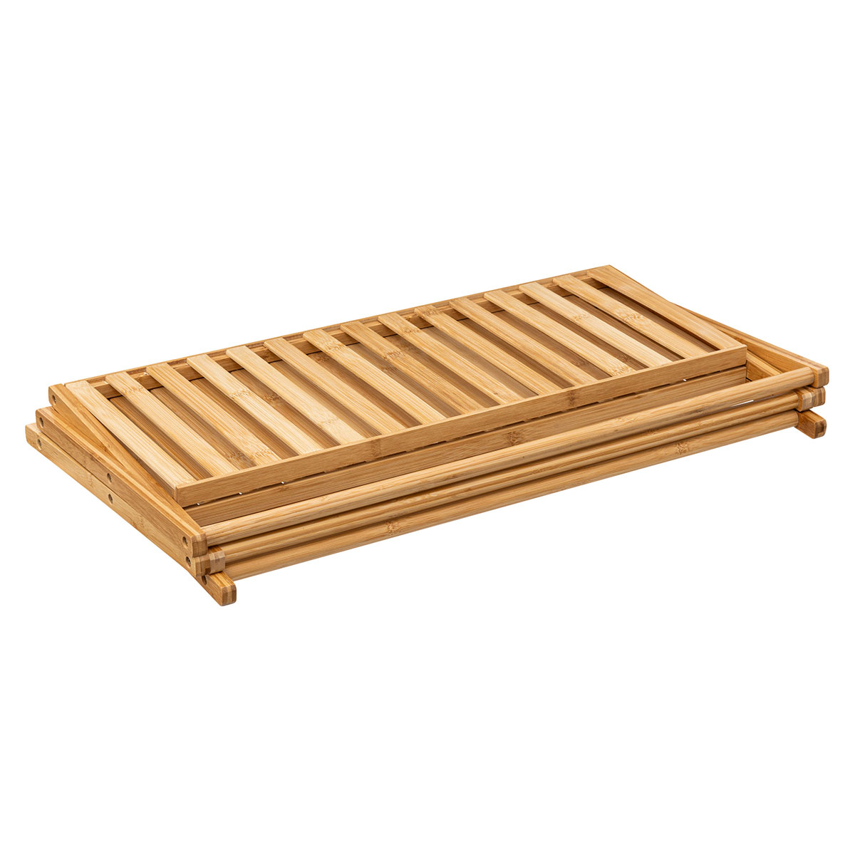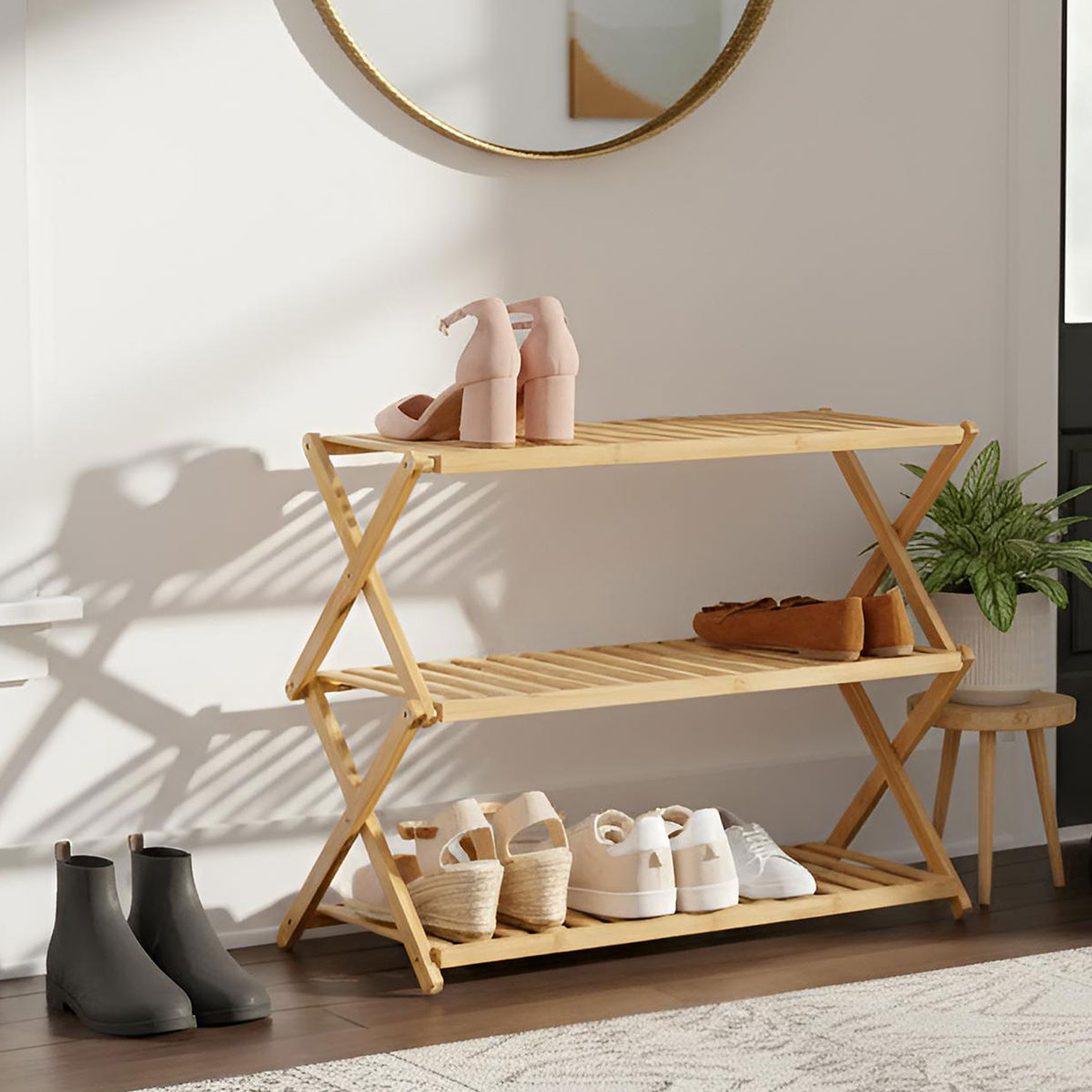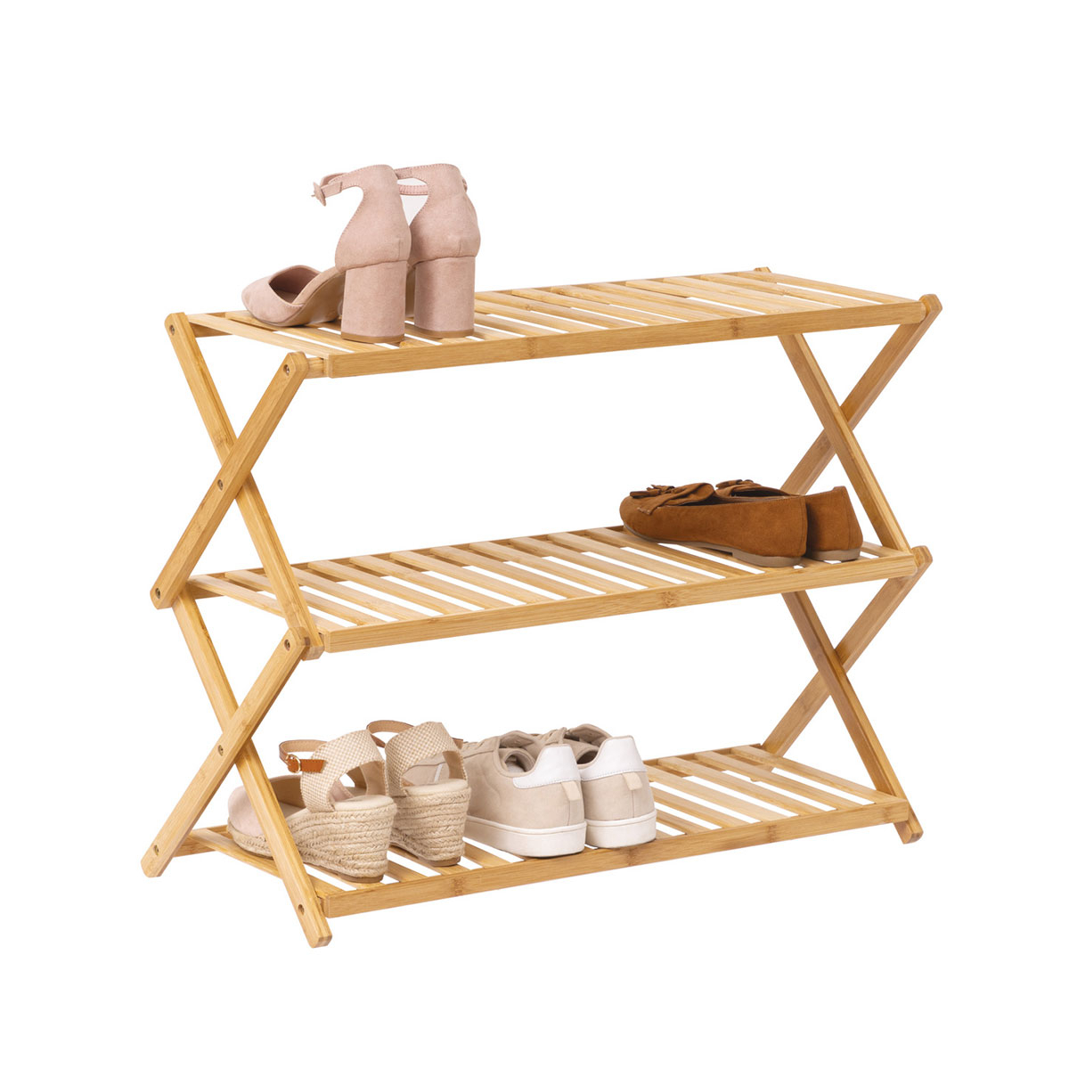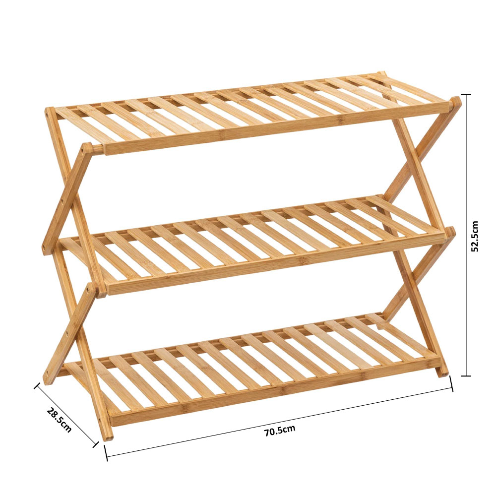 Πτυσσόμενη παπουτσοθήκη σε φυσικό χρώμα ξύλου, ιδανική για να διατηρήσετε οργανωμένα τα παπούτσια σας. Μπορείτε να την αποθηκεύσετε όταν δεν τη χρησιμοποιείτε καταλαμβάνοντας ελάχιστο χώρο.
