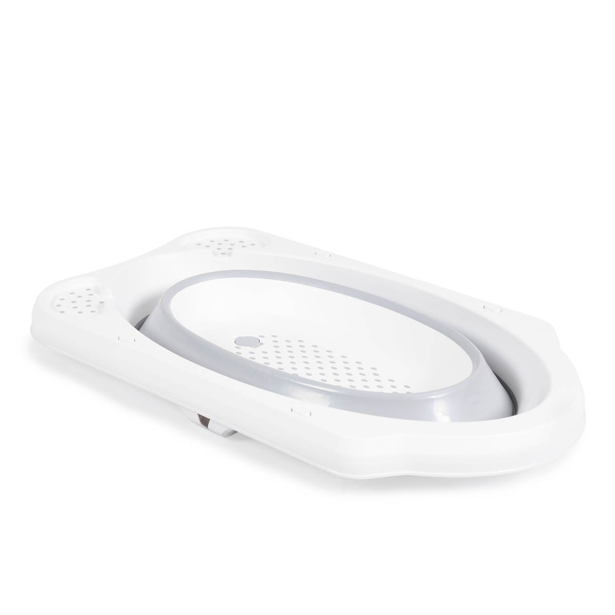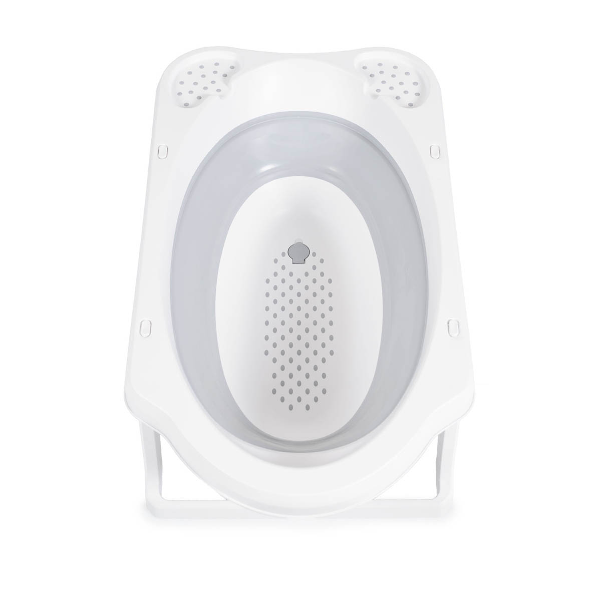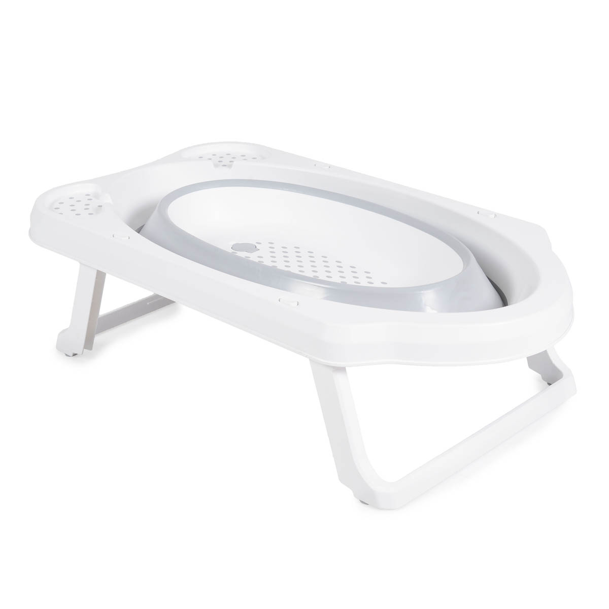 Πτυσσόμενο μπανάκι από την εταιρεία Cangaroo σε λευκό-γκρι χρώμα. Κατασκευασμένο από εύκαμπτο υλικό με ανθεκτικά πλαστικά μέρη. Διαθέτει τάπα αποστράγγισης για να απομακρύνει το νερό και αντιολισθητικές επιφάνειες για να μην γλιστράει το παιδί. Είναι πτυσσόμενο, με αναδιπλούμενα πόδια ώστε να μεταφέρεται και να αποθηκεύεται εύκολα. Κατάλληλο από την γέννηση.