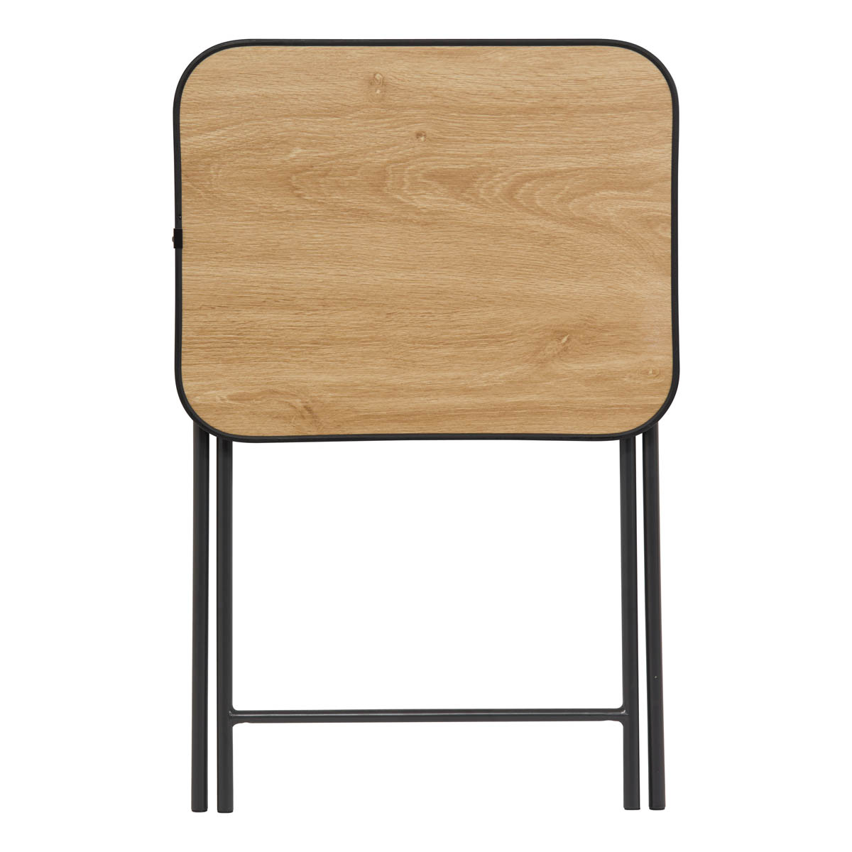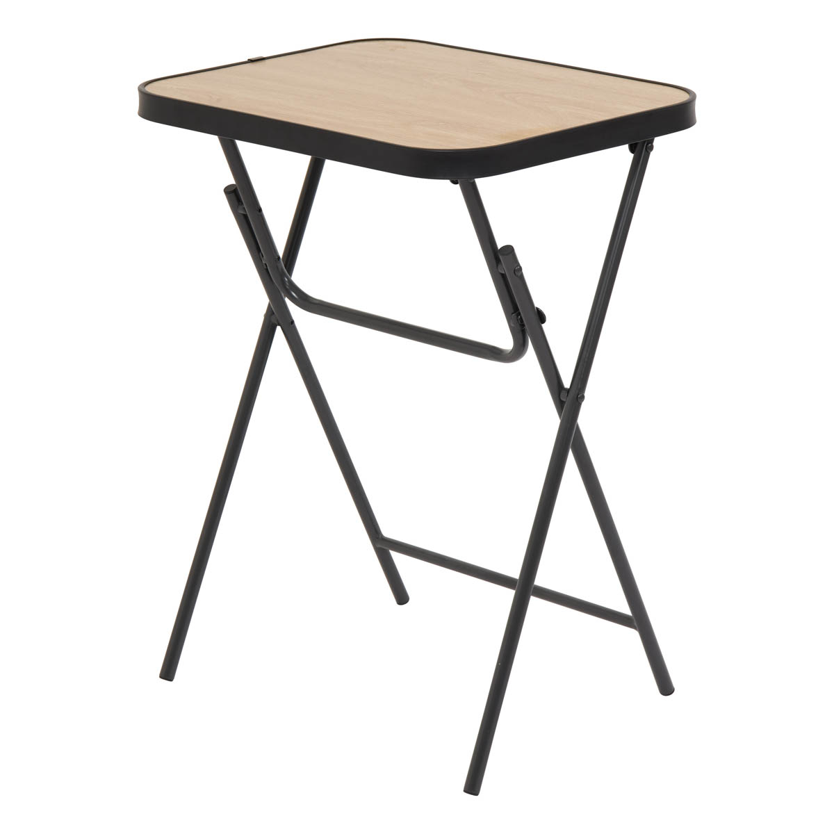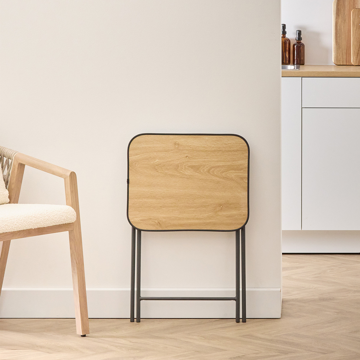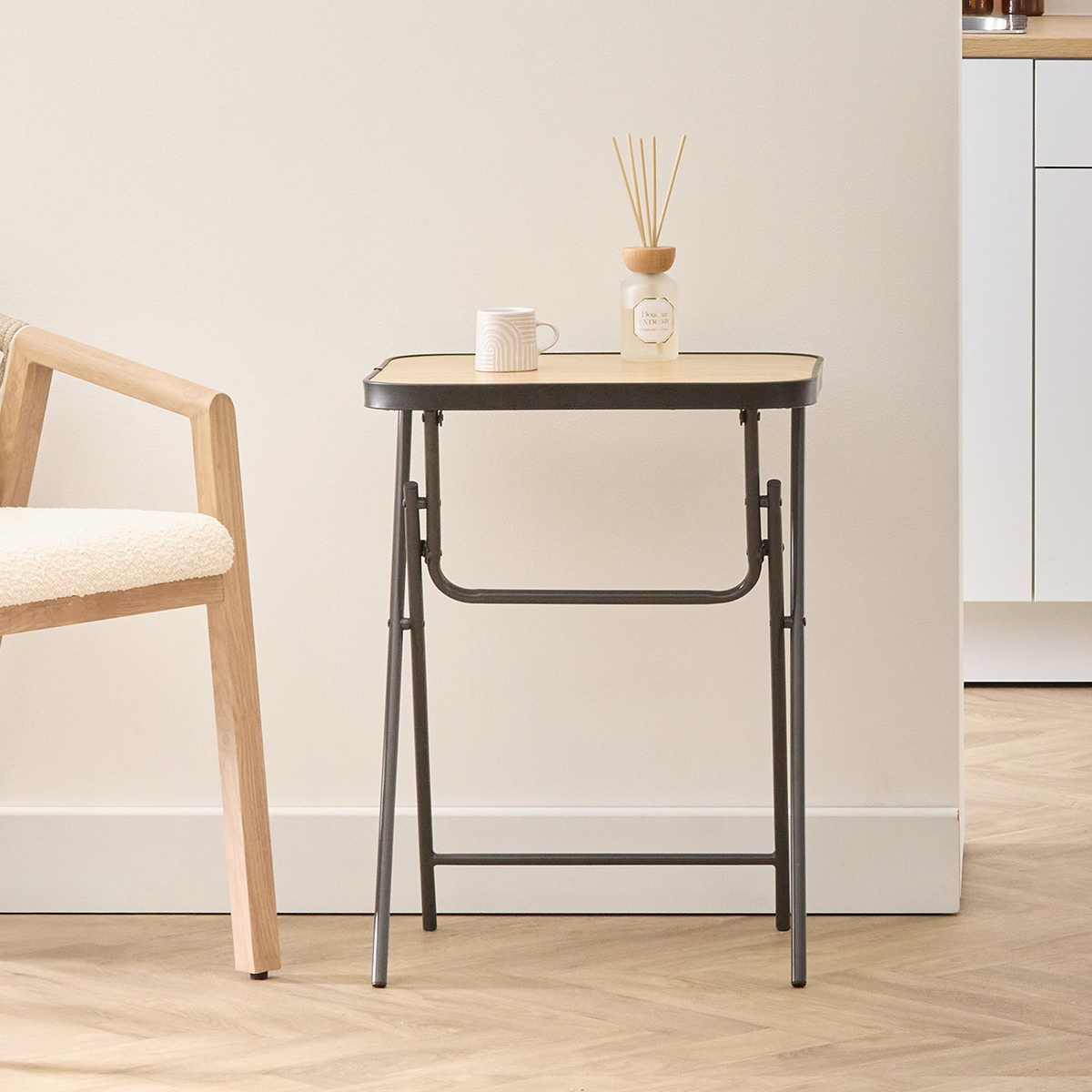 Τραπέζι κουζίνας πτυσσόμενο, κατασκευασμένο από ατσάλι και MDF_E1. Ο σκελετός του είναι σε μαύρο χρώμα, ενώ η επιφάνεια είναι μπεζ με εφέ ξύλου. Μπορείτε να το διπλώσετε και να το αποθηκεύσετε όταν δεν το χρησιμοποιείτε. Ιδανικό για κουζίνα και για μικρούς χώρους. *Το προϊόν έρχεται μονταρισμένο.*