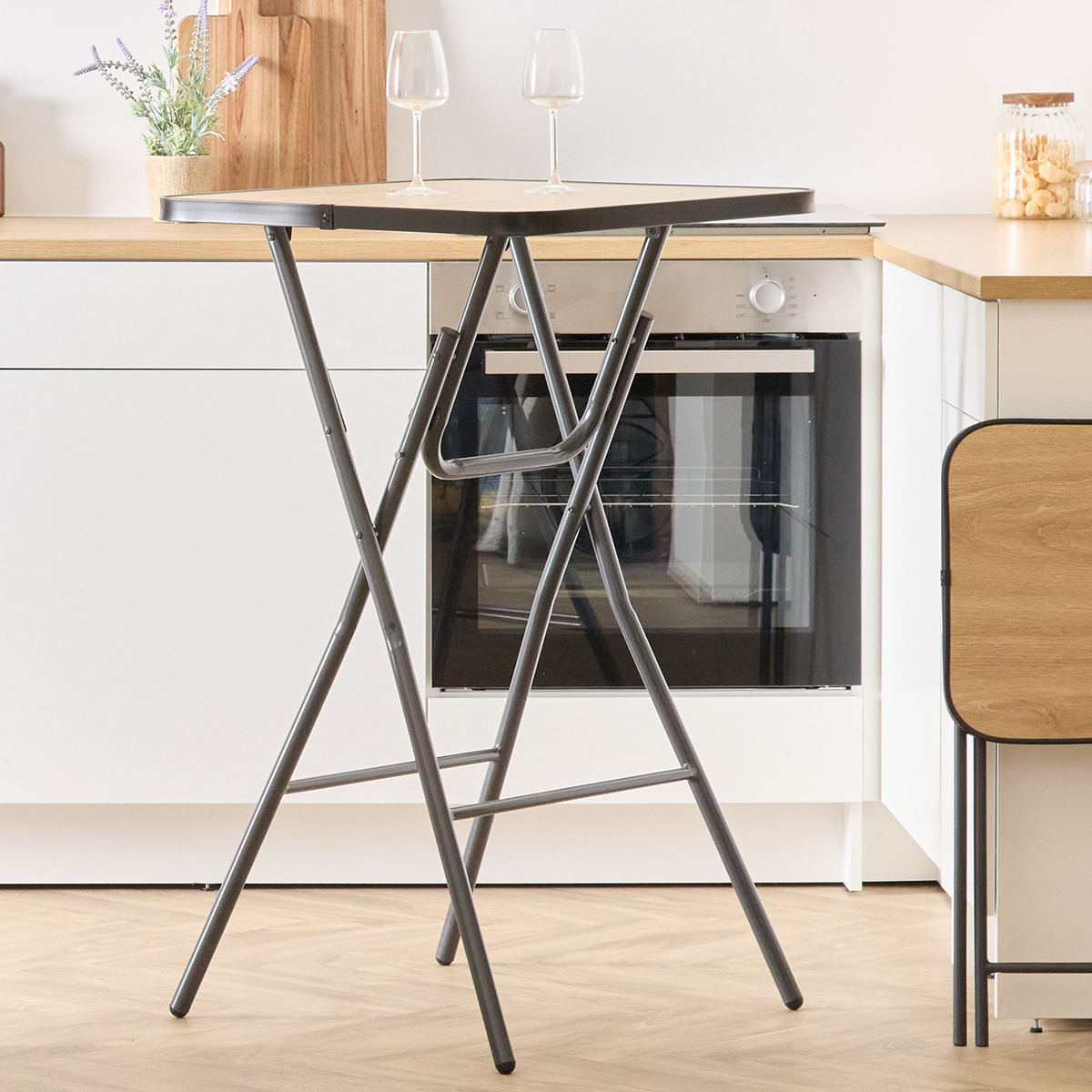 Τραπέζι μπαρ πτυσσόμενο για 4 άτομα, κατασκευασμένο από ατσάλι και MDF_E1. Ο σκελετός του είναι σε μαύρο χρώμα, ενώ η επιφάνεια είναι μπεζ με εφέ ξύλου. Μπορείτε να το διπλώσετε και να το αποθηκεύσετε όταν δεν το χρησιμοποιείτε. Ιδανικό για κουζίνα και για μικρούς χώρους. *Το προϊόν έρχεται μονταρισμένο.*