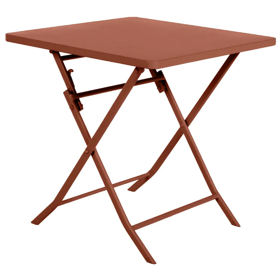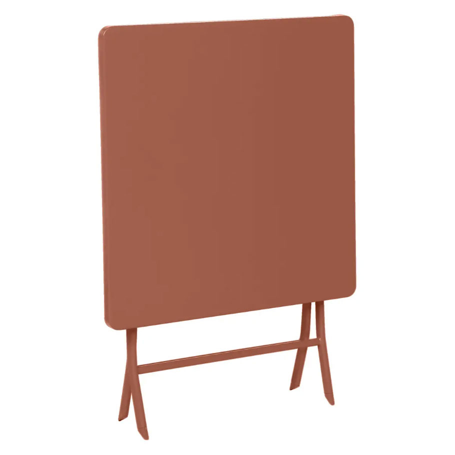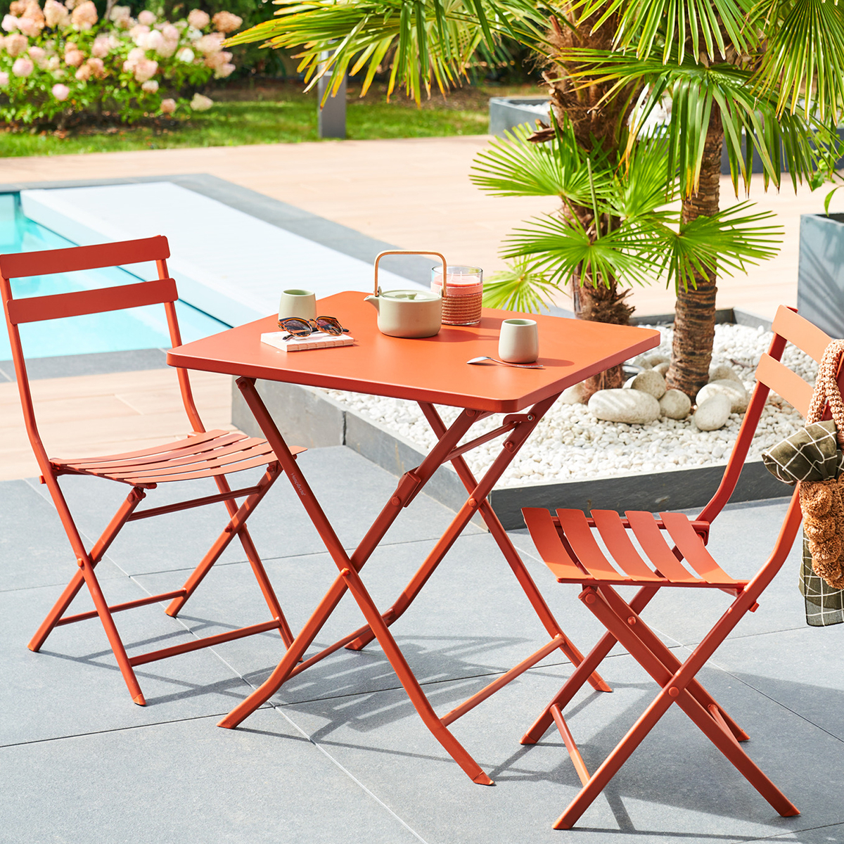 Τραπέζι εξωτερικού χώρου με καρέκλες σε απόχρωση τερακότα. Κατασκευασμένα από υψηλής ποιότητας υλικά, με ειδική επίστρωση που προστατεύει από την οξείδωση, την διάβρωση και την σκουριά. Το χρώμα τους δεν αλλοιώνεται από την επαφή με τον ήλιο και αυτό τα καθιστά ιδανικά για το μπαλκόνι, τον κήπο ή την βεράντα. Είναι αναδιπλούμενα για να εξοικονομείτε χώρο και να τα μεταφέρετε εύκολα.