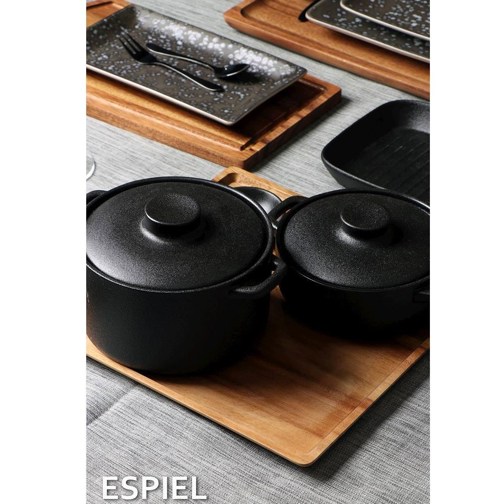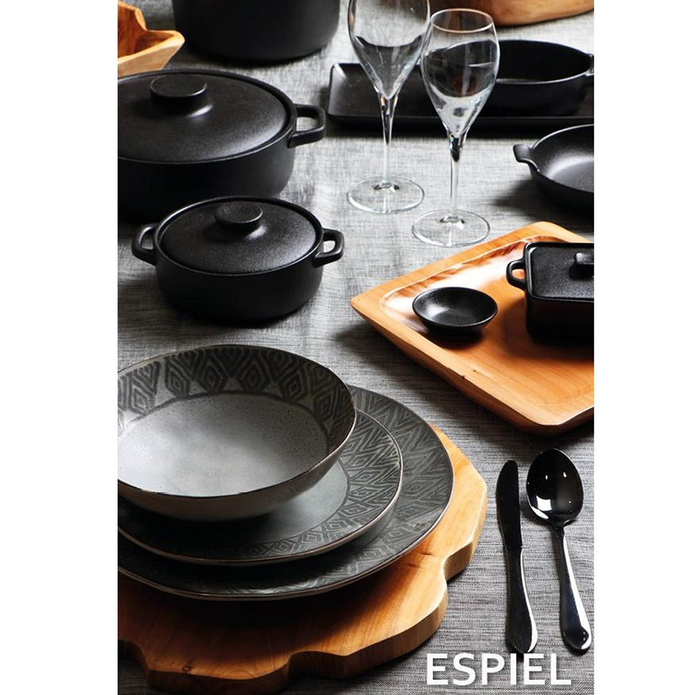 Ρηχό πυρίμαχο σκεύος γιουβετσάκι με καπάκι από την εταιρεία Espiel. Είναι κατασκευασμένο από κεραμικό υλικό σε μαύρο χρώμα. Διαθέτει λαβές για εύκολη μεταφορά. Με όψη μαντεμιού που αποπνέει "παράδοση", αλλά κι ο τρόπος κατασκευής της από υψηλής ποιότητας stoneware προσθέτει αντοχή στο προϊόν και εξασφαλίζει ένα υγιεινό μαγείρεμα. Μπορεί να χρησιμοποιηθεί και ως σκεύος σερβιρίσματος. Συνδυάστε το με τα υπόλοιπα σκεύη της ίδιας συλλογής για ένα ολοκληρωμένο αποτέλεσμα στην κουζίνα σας.