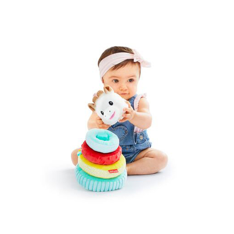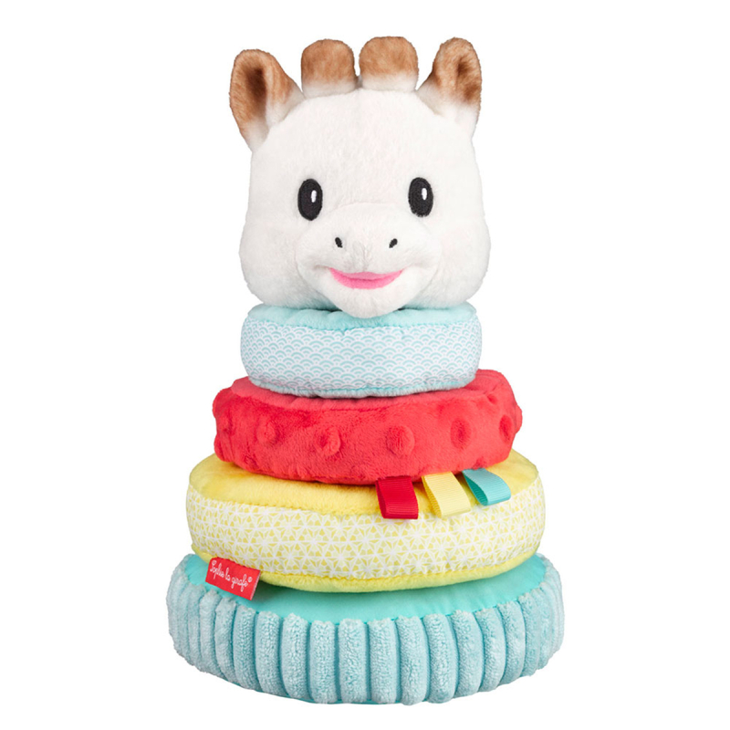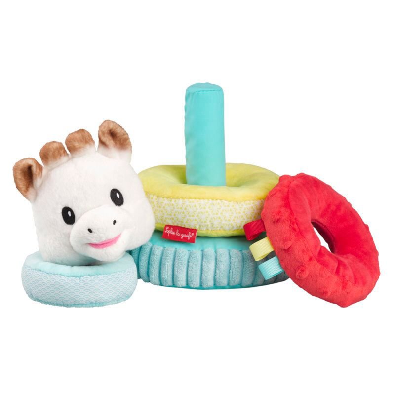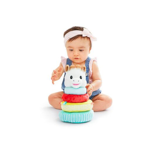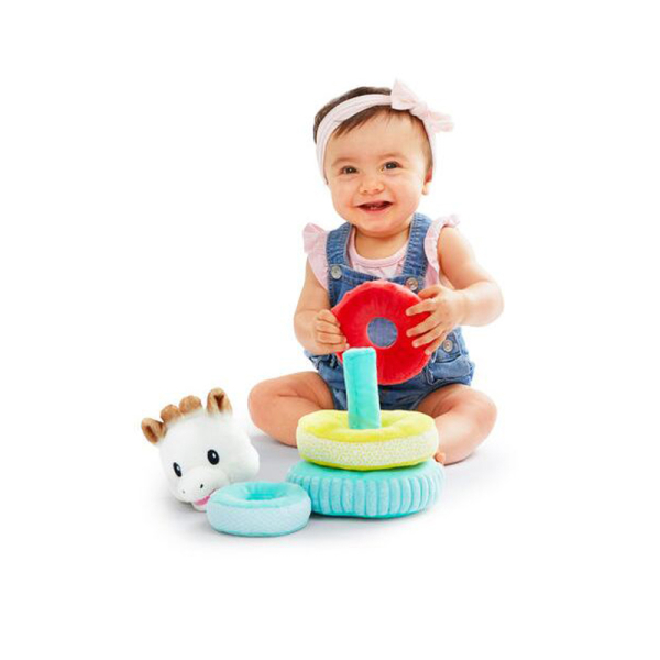 Υφασμάτινη πυραμίδα στοίβαξης από την Σόφι την καμηλοπάρδαλη. Αποτελείται από 4 αφρώδεις κρίκους διαφορετικών μεγεθών, πολύ απαλούς και ειδικά σχεδιασμένους για τα μικρά χεράκια. Βοηθά στην ανάπτυξη της λεπτής κινητικότητας και της αντίληψης του μεγέθους. Το να βάζει και να βγάζει το κεγάλι της Σόφις θα γίνει μία από τις αγαπημένες του δραστηριότητες ενώ μπορεί να το παίρνει παντού μαζί του χωρίς την πυραμίδα. Οι κρίκοι έχουν διάφορες υφές, κουδούνι, ετικέτες και ήχο τσαλακωμένου χαρτιού. Ιδανικό για αγοράκια και κοριτσάκια. Κατάλληλο για ηλικίες 6+ μηνών.