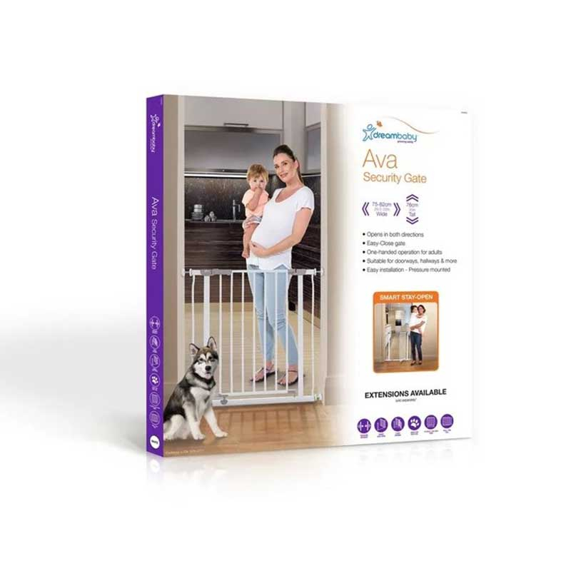 Πόρτα ασφαλείας Ava από την εταιρεία Dream Baby για να περιορίσετε το μωρό σας και να εμποδίσετε την πρόσβασή του σε επικίνδυνες περιοχές του σπιτιού όπως είναι το μπάνιο, η κουζίνα και οι σκάλες. Η πόρτα τοποθετείται με σύστημα πίεση 4 σημείων, χωρίς βίδες και δυσκολίες στην εγκατάσταση. Είναι ιδανική για κάθε τύπο σπιτιού και μπορεί να προσαρμοστεί σε πόρτες, διαδρόμους και κλιμακοστάσια. Ταιριάζει σε ανοίγματα από 75εκ. έως 81εκ. Υπάρχει η δυνατότητα επέκτασης έως 100εκ. χρησιμοποιώντας τις προαιρετικές επεκτάσεις που διατίθενται στις διαστάσεις 9εκ., 18εκ., 27εκ., και 36εκ., οι οποίες πωλούνται ξεχωριστά. Είναι μεταλλική σε λευκό χρώμα και κατασκευασμένη από ανθεκτικά και υψηλής ποιότητας υλικά. Διαθέτει λειτουργία One-Handed και μπορείτε να ανοιγοκλείσετε την πόρτα με ένα χέρι, ενώ κρατάτε το μωρό σας αγκαλιά. Η πόρτα ανοίγει και προς τις δύο κατευθύνσεις, για περισσότερη ευκολία, αλλά υπάρχει και η δυνατότητα περιορισμού του ανοίγματος σε μία μόνο κατεύθυνση, η οποία είναι ιδιαίτερα σημαντική όταν τοποθετείται στην κορυφή των σκαλοπατιών. Εξασφαλίζει επιπλέον ασφάλεια με τη λειτουργία διπλού κλειδώματος. Είναι ιδανική ακόμα και για κατοικίδια. Βάρος πόρτας: 4,2kg.